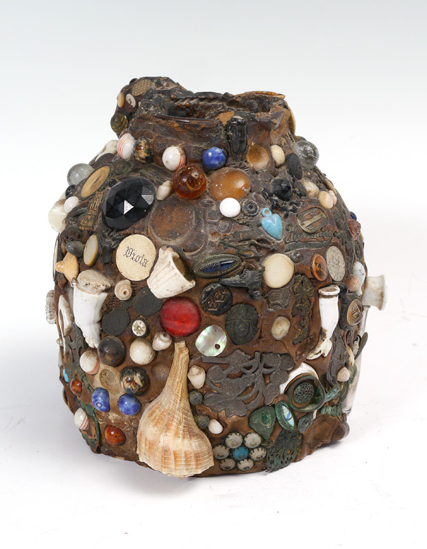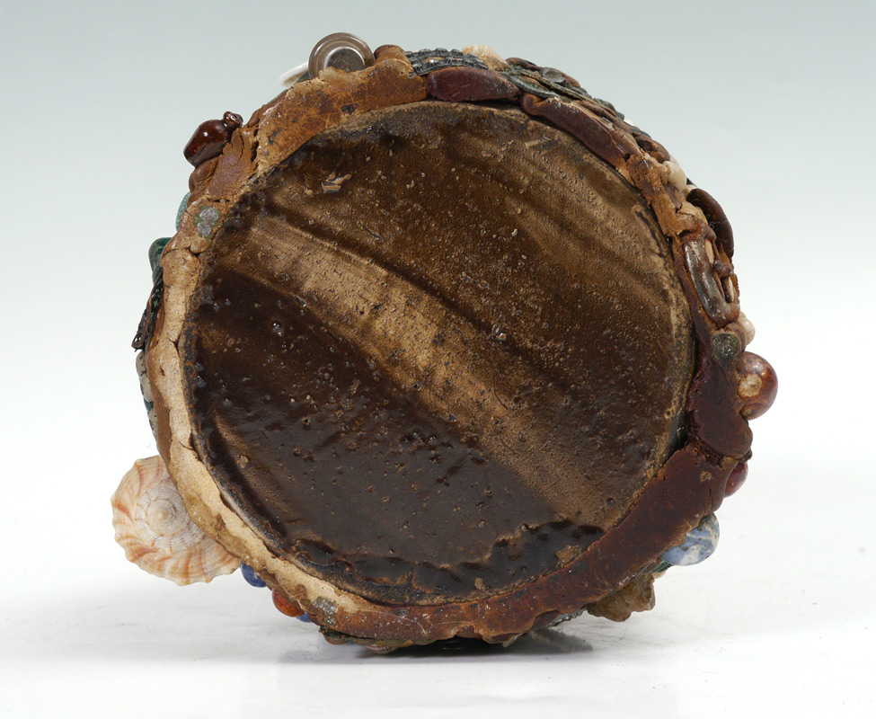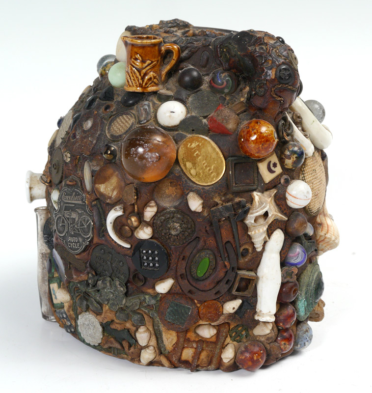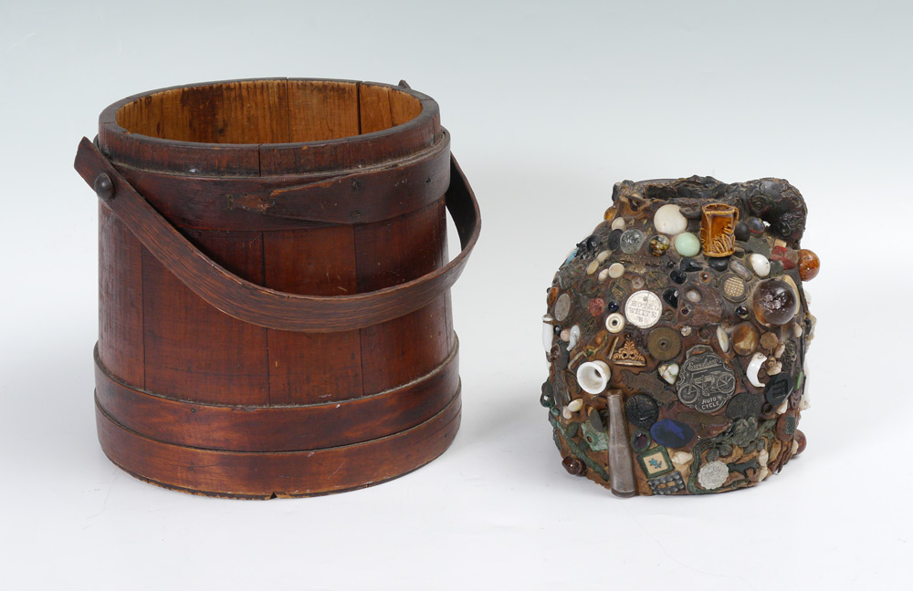 FOLK MEMORY ART JUG & FIRKIN: 2 pieces to include 1) Early 20th century memory jug with applied marbles, medallion, trinkets, shells, coins and more. 8'' h. x 7 1/4''. 2) Unmarked firkin, single band top, double band at base. Overall measures 9 1/4'' h. x 10 1/4''.