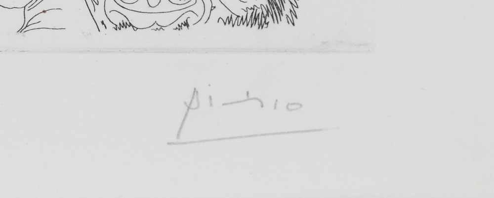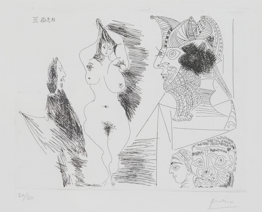 PICASSO, Pablo, (French, 1881-1973): Jeune femme et gentilhomme, Sept. 18, 1968, Etching, image size 10 1/2'' x 8 1/4'', 17 1/2'' x 12 1/4'', pencil signed, dated in the plate, and #'d 30/50. From Series 347 (B. 1803; Ba. 1820), 1968, framed 23'' x 25''.
