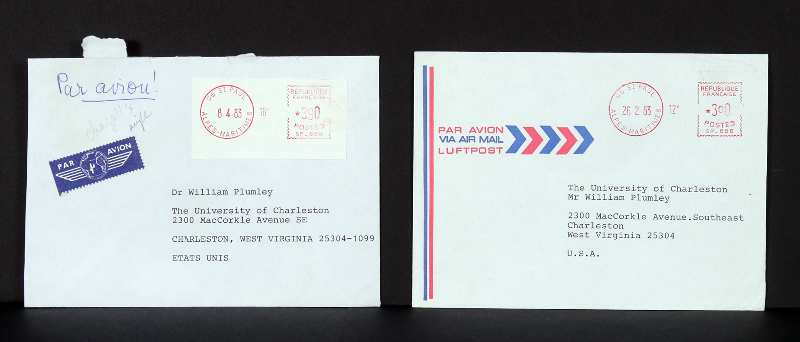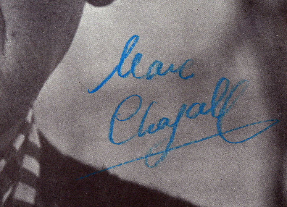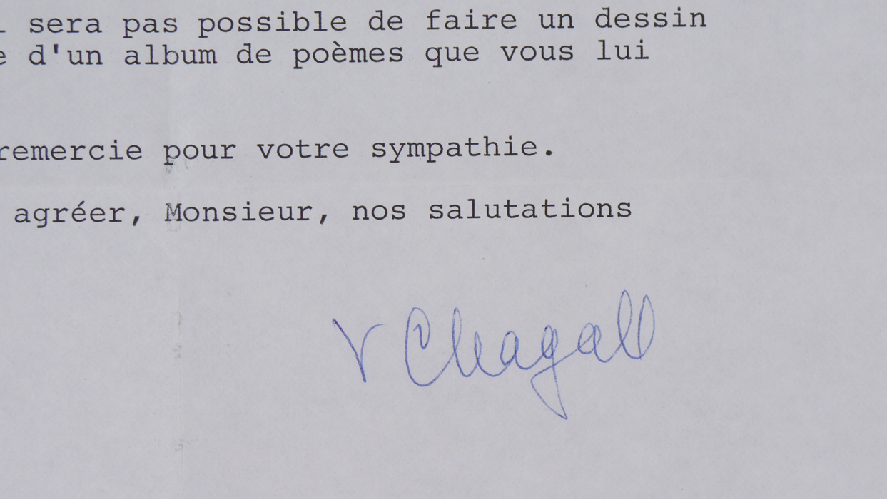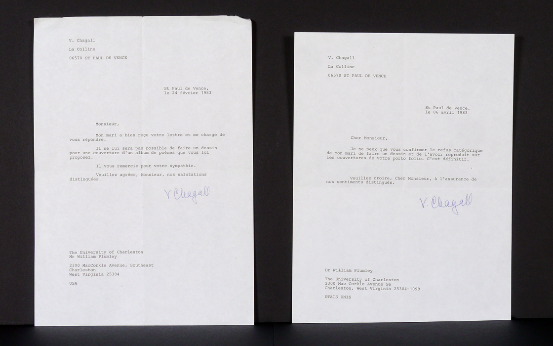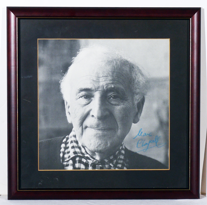 MARC CHAGALL AUTOGRAPHED PHOTOGRAPH: Offset lithograph of the famous artist Marc Chagall, signed in blue crayon or grease pencil lower right. Sight size 10 3/4'' x 10 1/2'', framed 15 1/2'' x 15 1/2''. Sold with 2 letters dated 1983, signed by his wife Valentina. Both appear to be refusal letters by Valentina for a request of a painting to Mr. Plumley's book of poetry, one translated '' can only confirm the categorical refusal of my husband and make a drawing to have it reproduced on the covers of your portfolio. It is definitive. Please accept, dear sir, has the assurance of our distinguished sentiments.'', the other is also a rejection letter for a proposed drawing. From the William Crawford Plumley Estate.