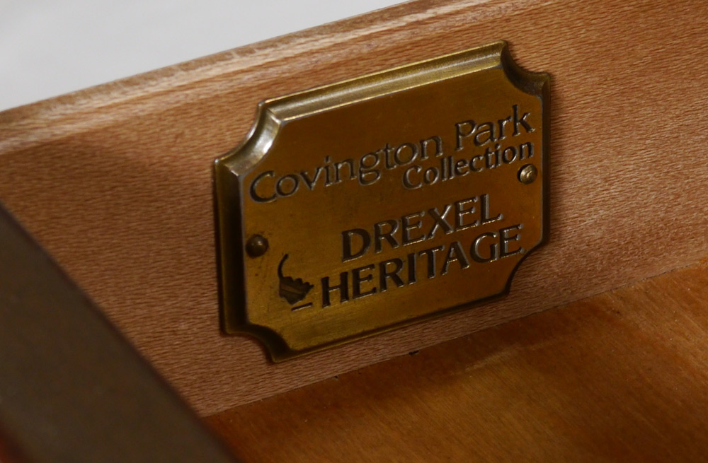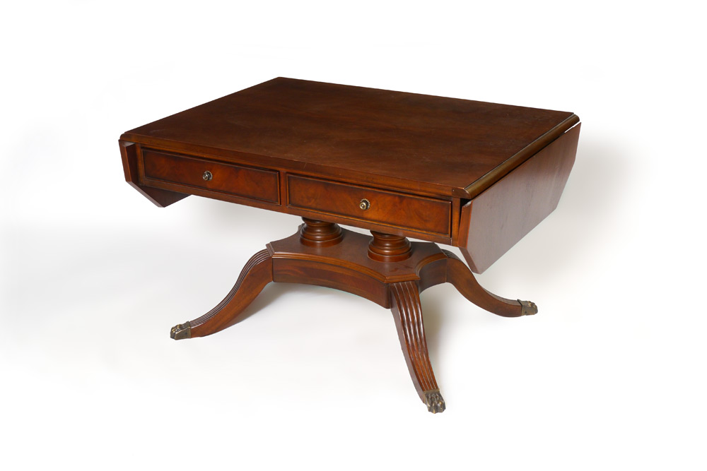 DREXEL HERITAGE COVINGTON PARK TABLE: Mahogany coffee table with drop leaf ends, splay legs ending in brass capped feet. Brass nameplate. Measures 25''h. x 30'' x 42'', with leaves extended to 60''.