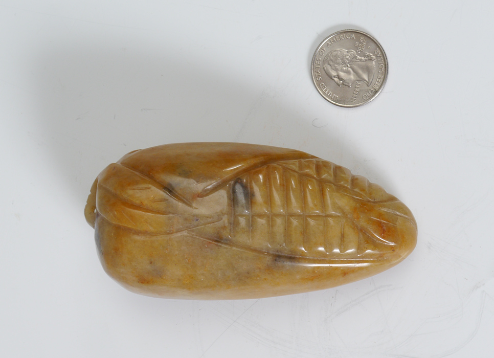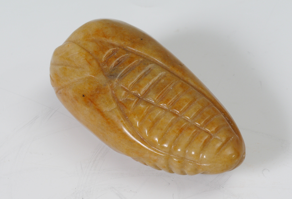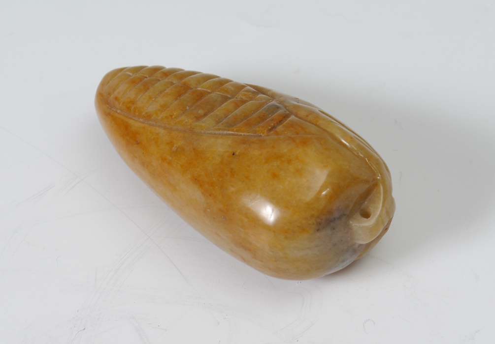 ORIENTAL YELLOW CARVED HARD STONE PENDANT: Possible yellow dragon jade, carved in the form of an ear of corn. Measures 4'' long.