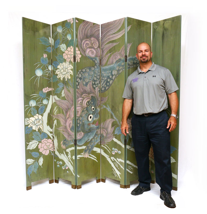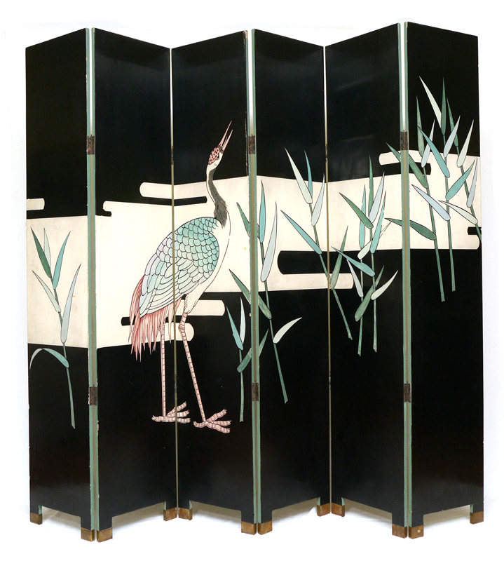 CHINESE CORAMANDEL 6 PANEL SCREEN: Carved and ploychrome decorated, one side with dragon / foo dog motif, the other with bamboo and crane motif. Each panel 84'' h. x 16''.