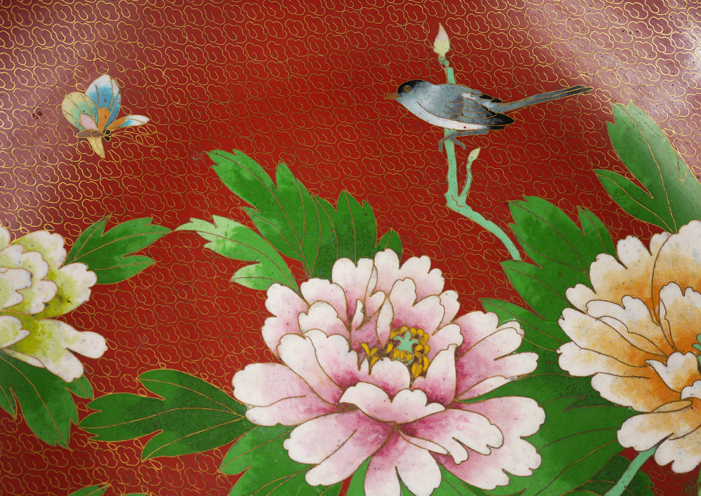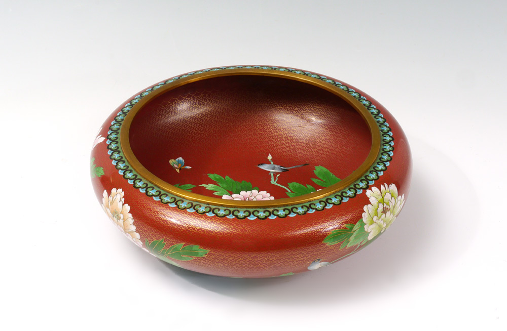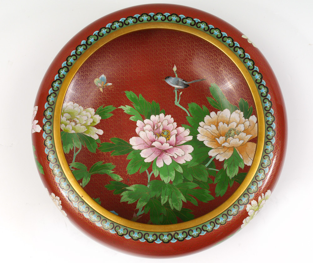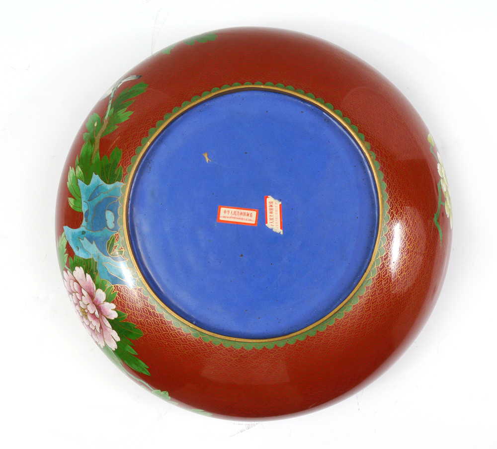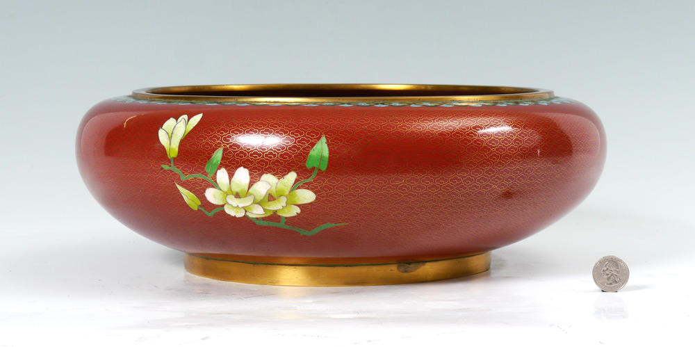 LARGE CLOISONNE CENTER BOWL: Ox blood ground with floral motifs, partial paper labels on base. 5'' h. x 15'' dia.
