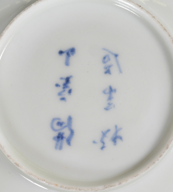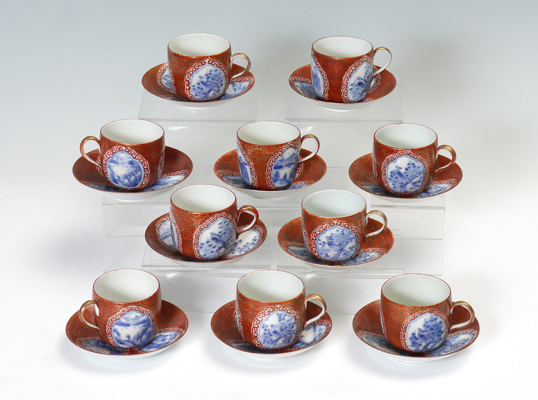 10 JAPANESE ARITAWARE IMARI CUPS & SAUCERS: Late 19th to early 20th century, red and gilt decoration with assorted oriental blue decorated themes in reserves. Marked in characters on base, cups 2 3/8'' h. x 3 1/2'', saucers 5''.