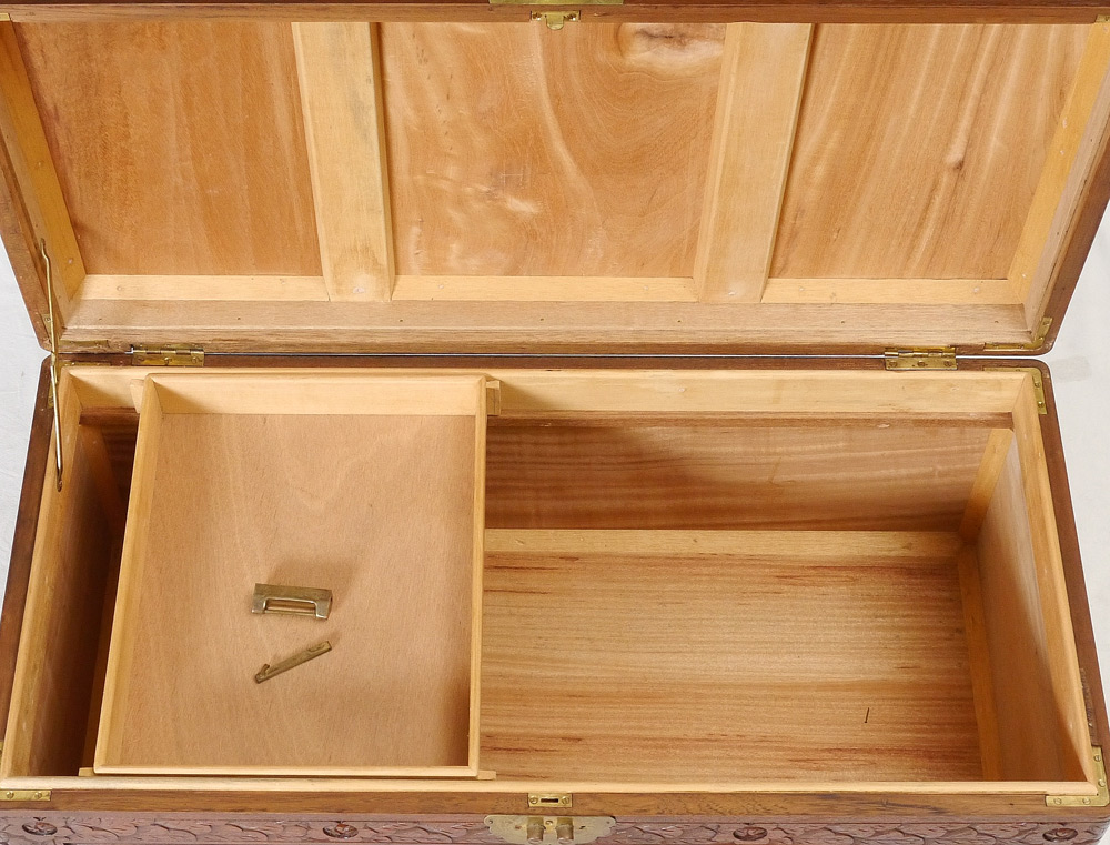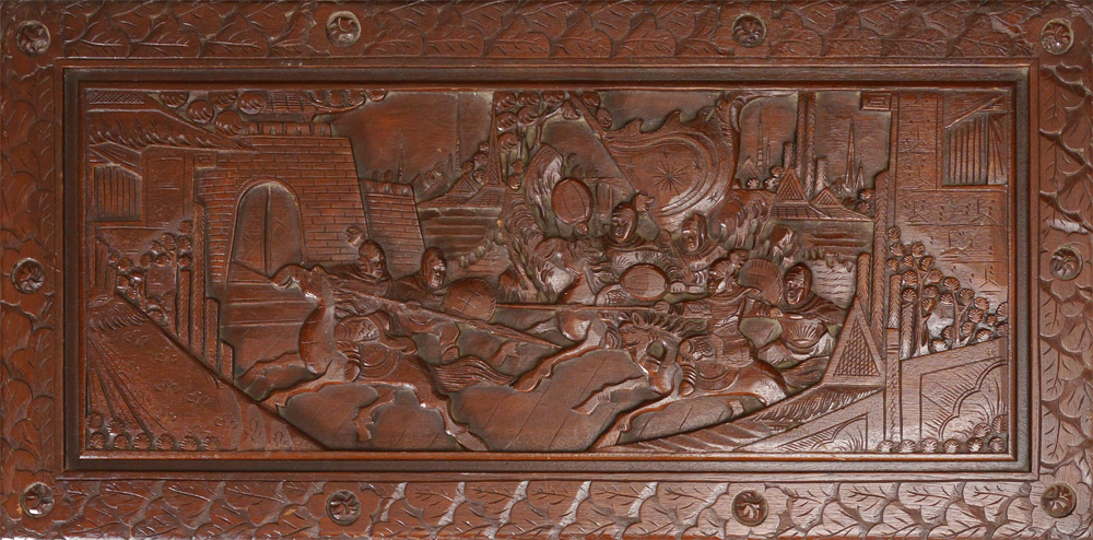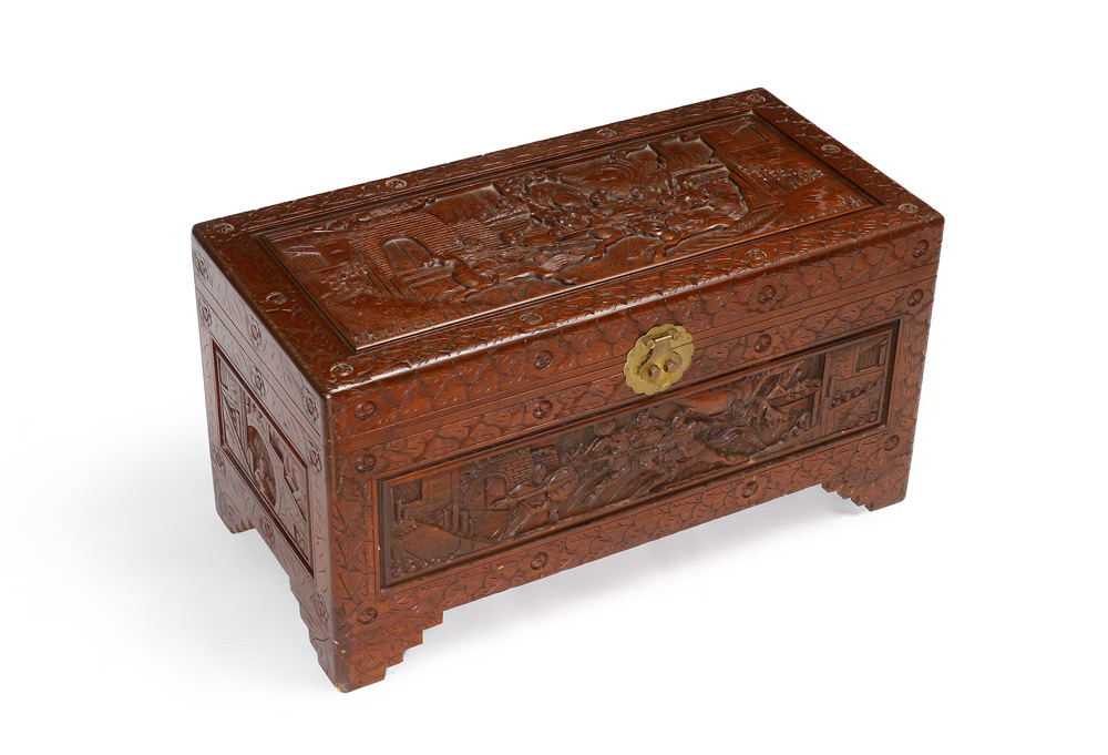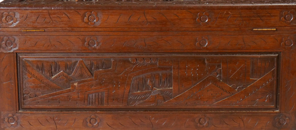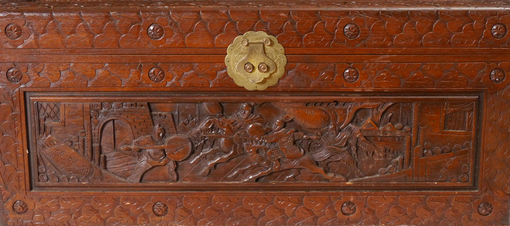 CHINESE FIGURAL CARVED TRUNK: Profusely carved all over with outdoor genre scenes and figures at battle in panels. Overall measures 18 3/4'' h. x 35 1/4'' x 17 1/2''.