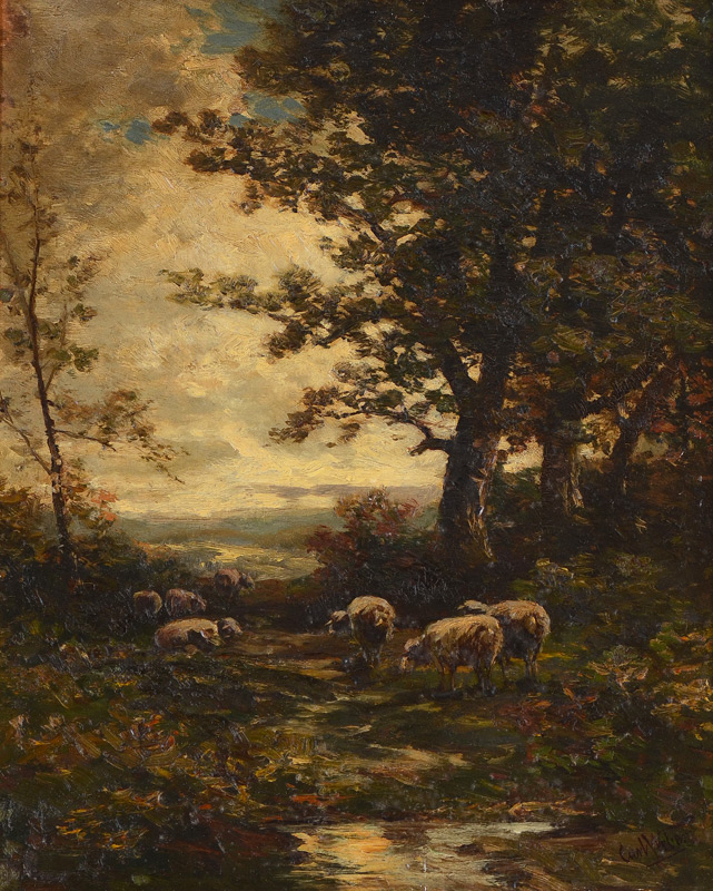 WEBER, Carl Philip, (American, 1850-1921): Sheep in a forest clearing at dusk, OIL/Panel, 18'' x 14 1/2'', signed lower right, contemporary gilded frame, 21 1/2'' x 18 1/2''