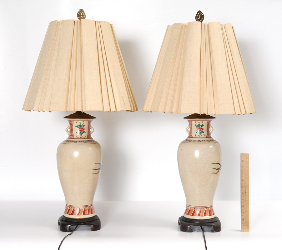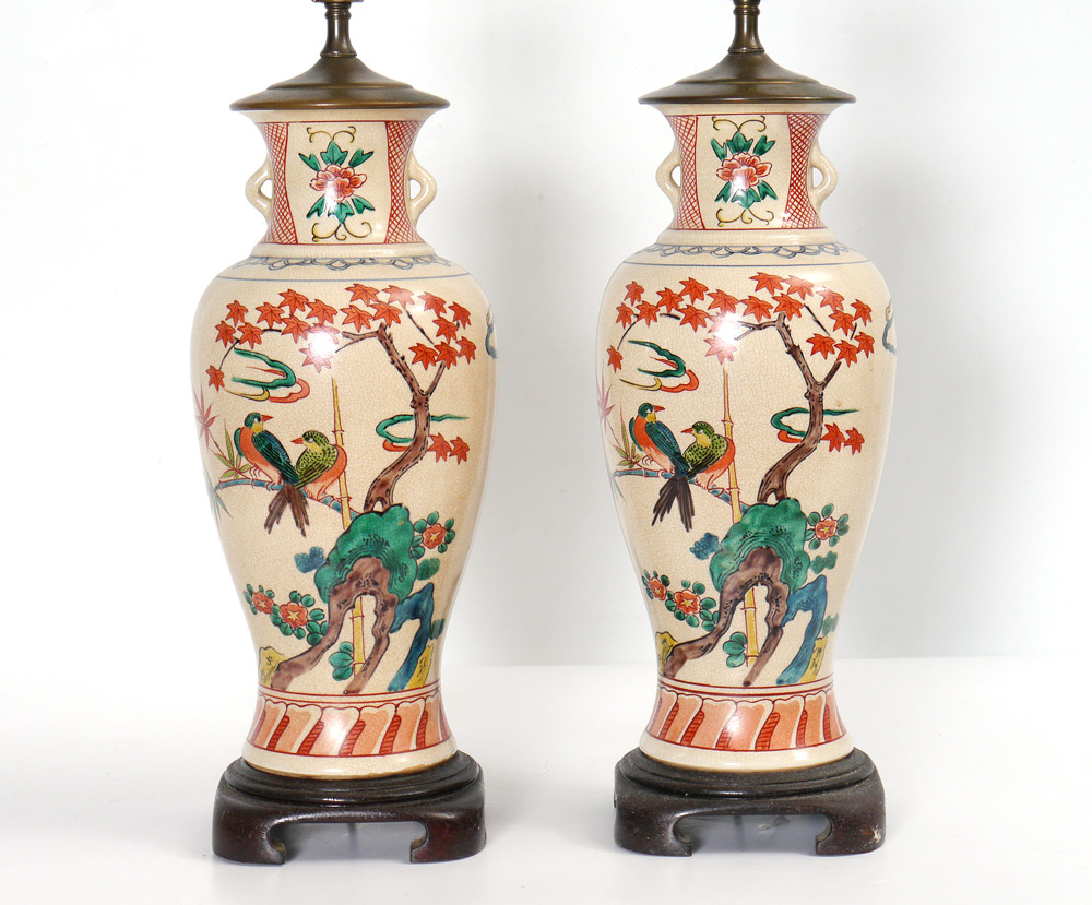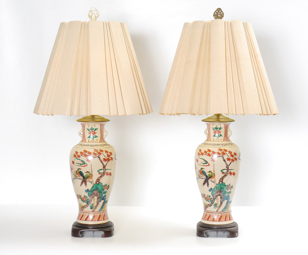 PAIR PAINTED CHINESE PORCELAIN LAMPS: Porcelain vases converted to lamps with painted birds in trees decoration, carved wood base, single socket fixture, overall 34 1/4'' h. to finial x 7 1/2''. Sold with cloth shades 14'' h. x 18''. William Crawford Plumley Estate.
