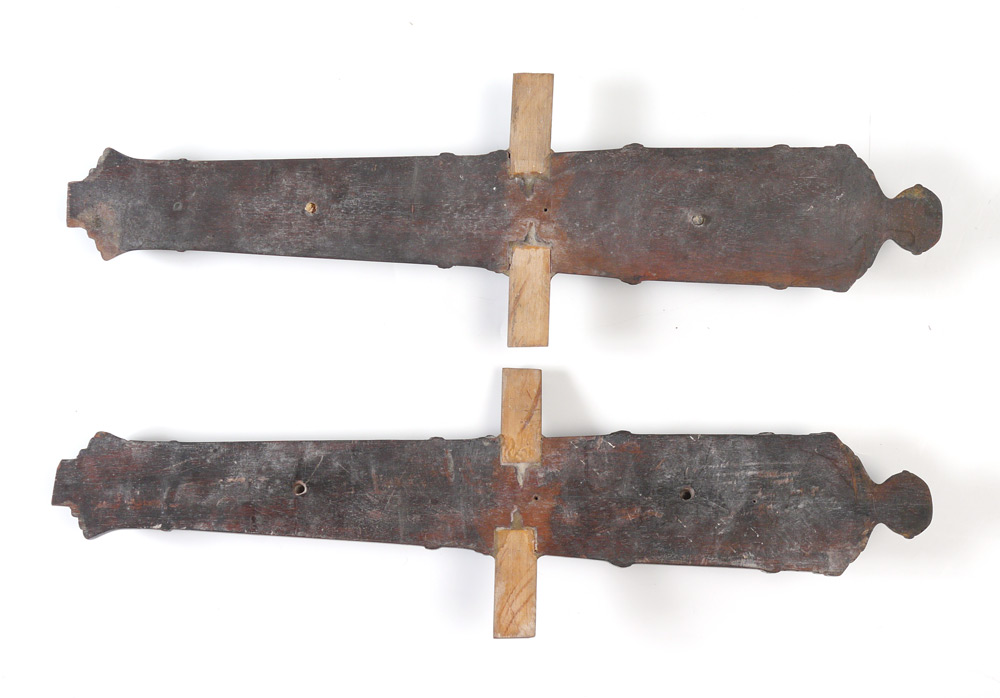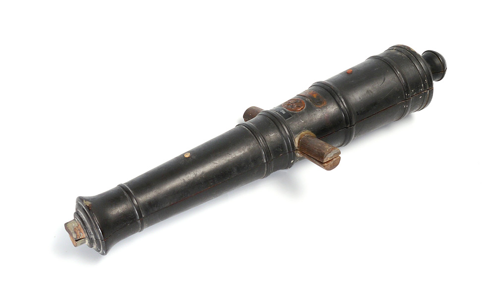 19TH CENTURY WOOD CANNON MOLD: Shaped wood mold used for the sand casting of signal cannons. Monogrammed brass plaque, overall 21'' long.