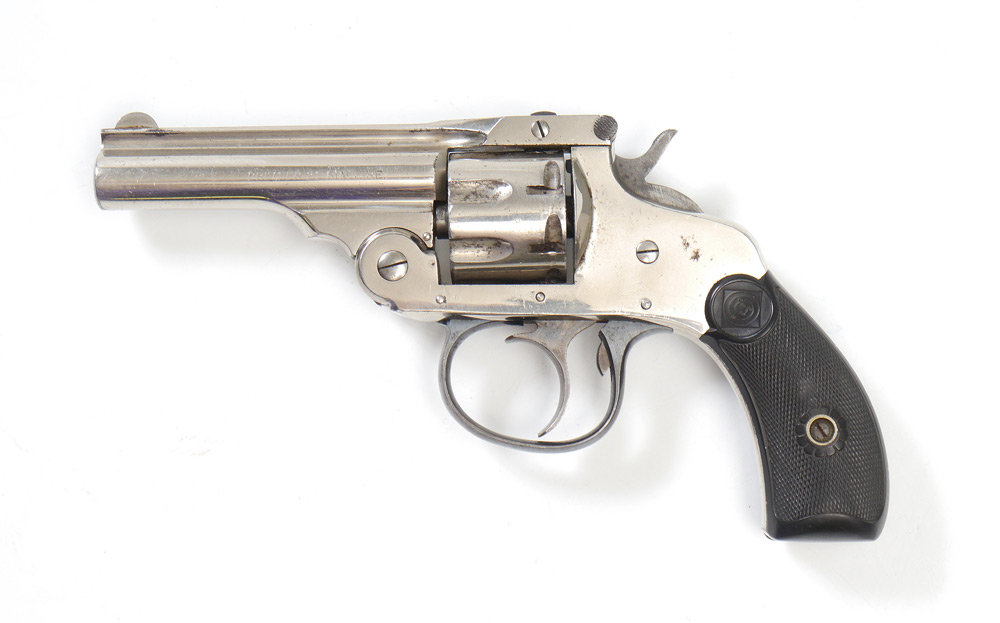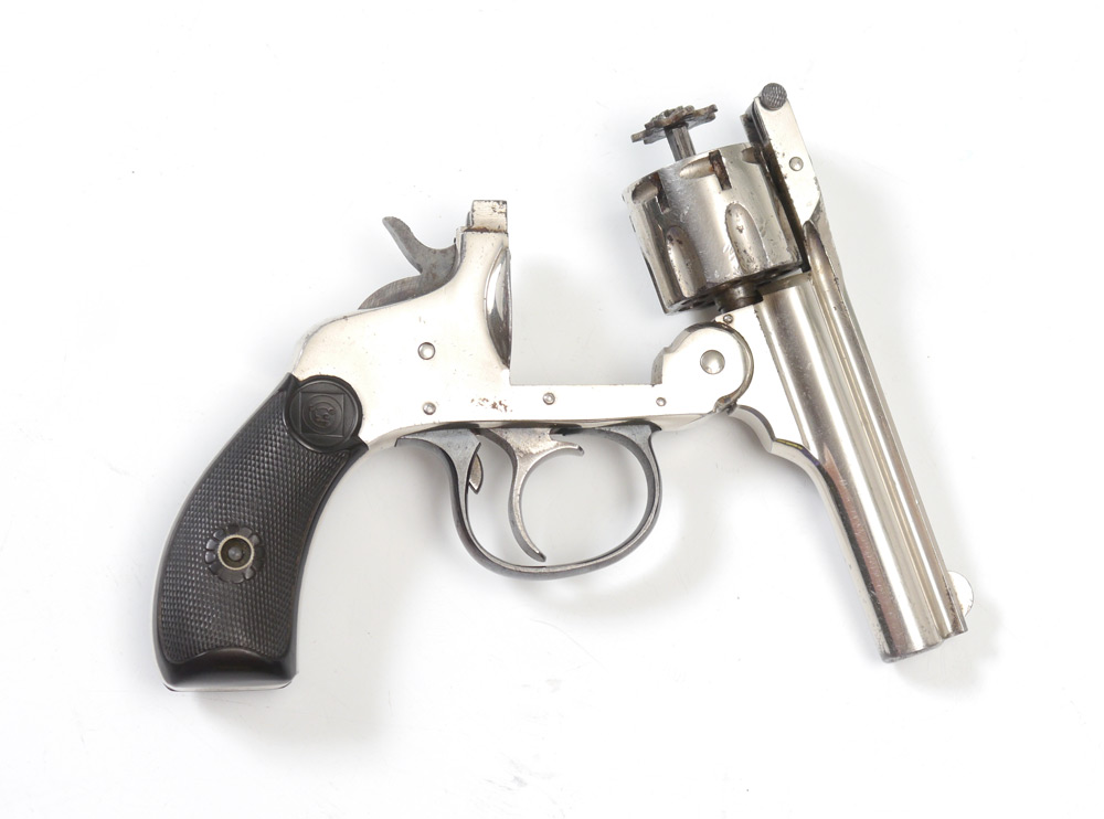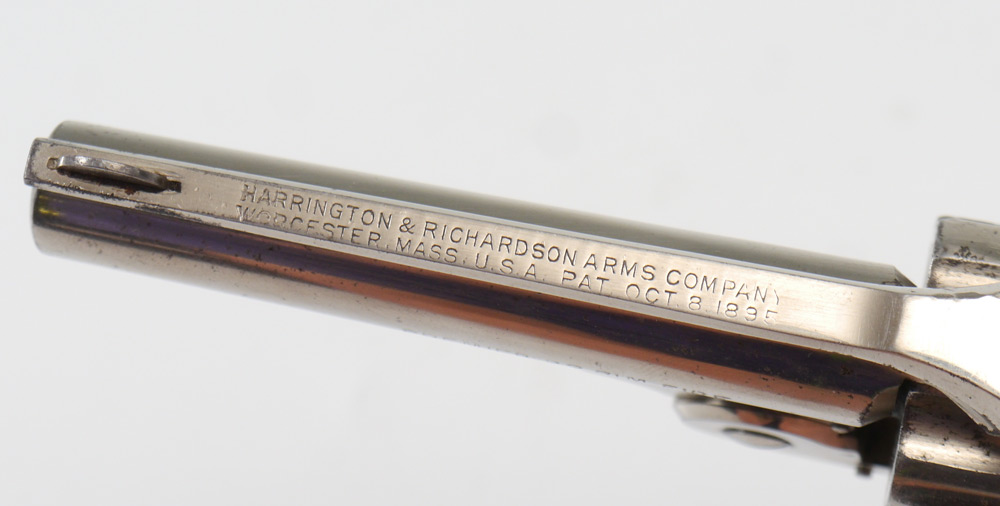 HARRINGTON & RICHARDSON TOP BREAK REVOLVER: 6 shot .22 rimfire 3'' barrel, nickel frame and cylinder, serial number 218632, hard rubber grips. Marked with address top spine of barrel. 6 1/2''. Pre-1898 manufacture, currently not functioning correctly.