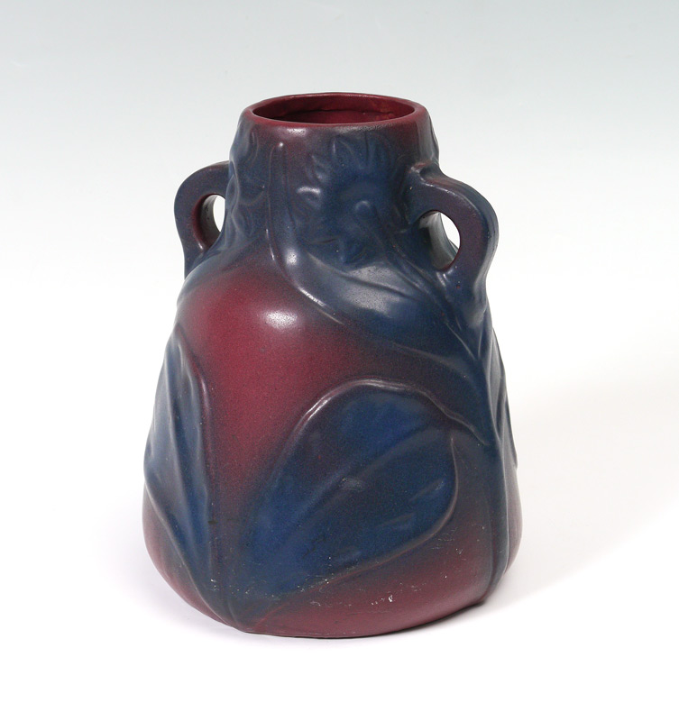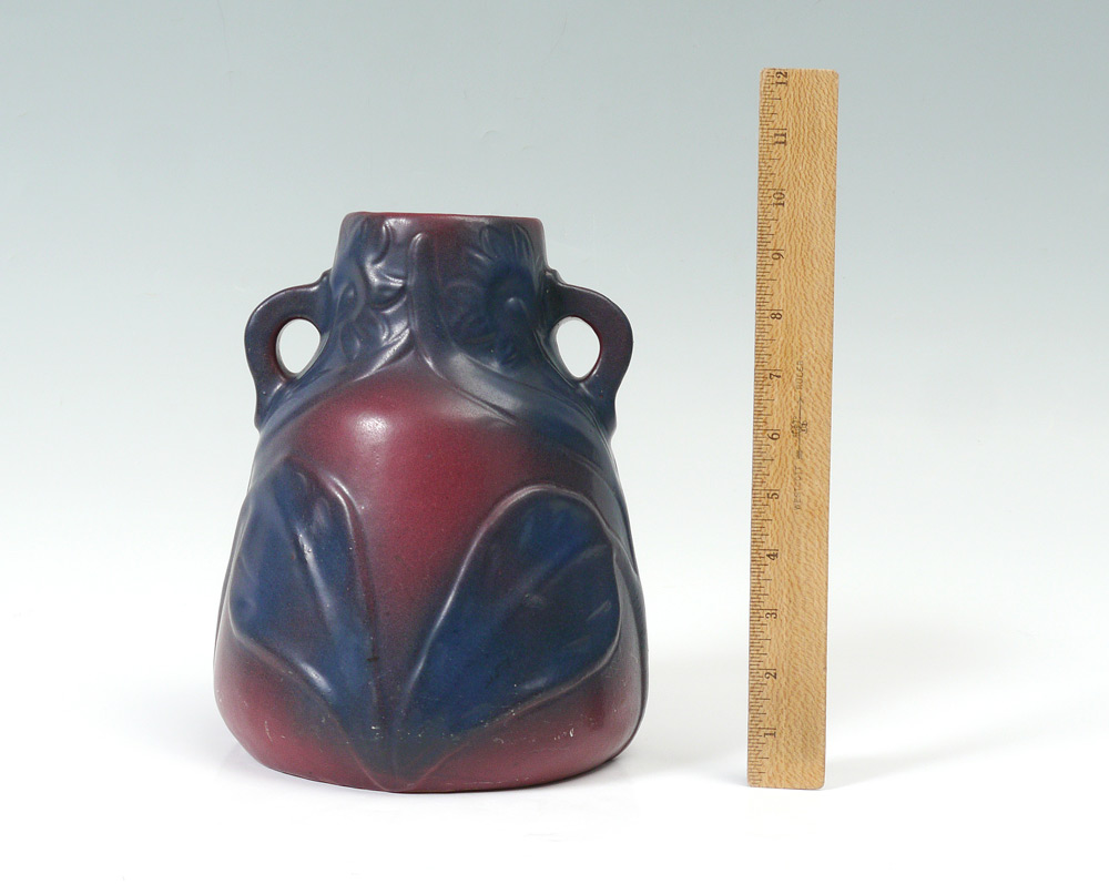 LARGE VAN BRIGGLE ART POTTERY VASE: Circa early 1920's, double handle vase with floral design in the Mulberry glaze. Incised mark on base, measures 9 1/2'' h. x 7 1/2''.