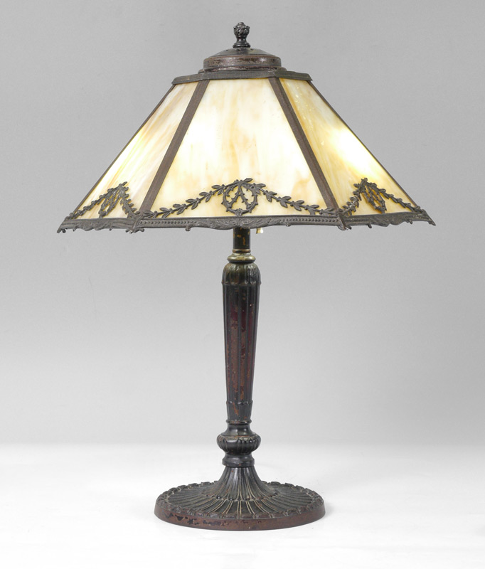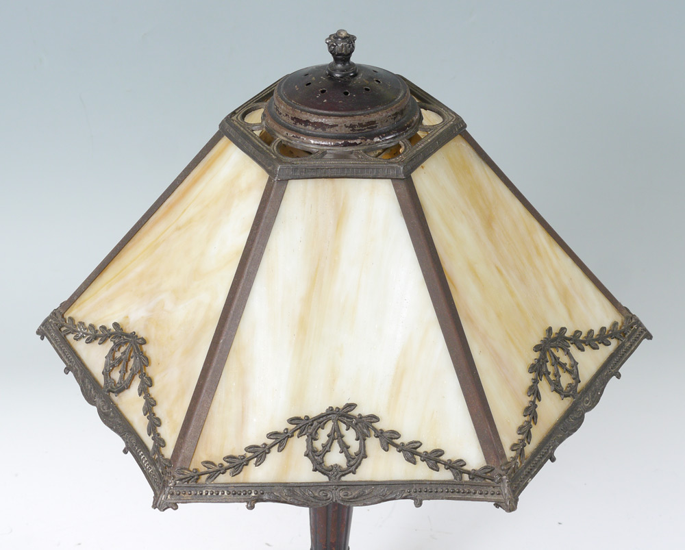 VINTAGE SLAG GLASS TABLE LAMP: 6 panel slag glass shade with floral garland decoration. Painted cast metal base with double socket fixture. Base overall 21'' h. x 7 1/2''. Shade 6 3/4'' h. x 16 1/2''.