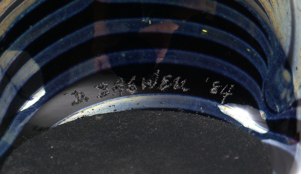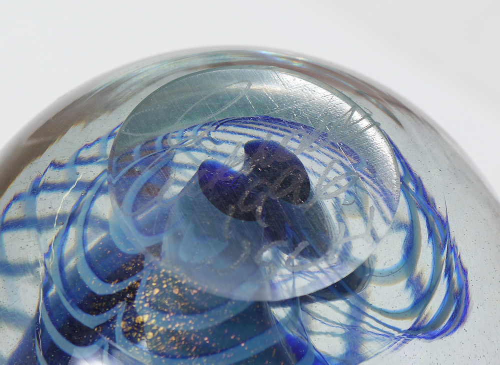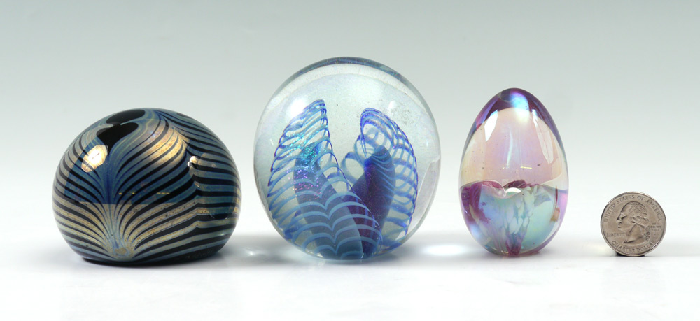 3 PIECE ART GLASS PAPERWEIGHTS: To include 1) Eickholt latticino, dated 1996, 3'' h. x 2 5/8''. 2) D. Bagwell pulled feather design, dated '84, 2 1/4'' h. x 2 3/4''. 3) Floral design, signed M. S. H. and dated '852 3/8'' h. x 1 5/8''.