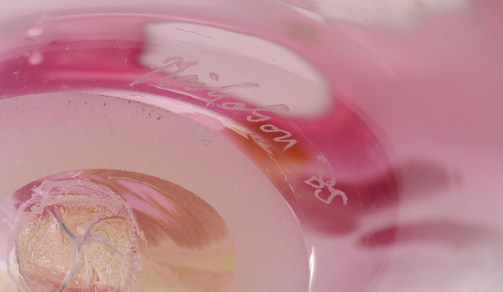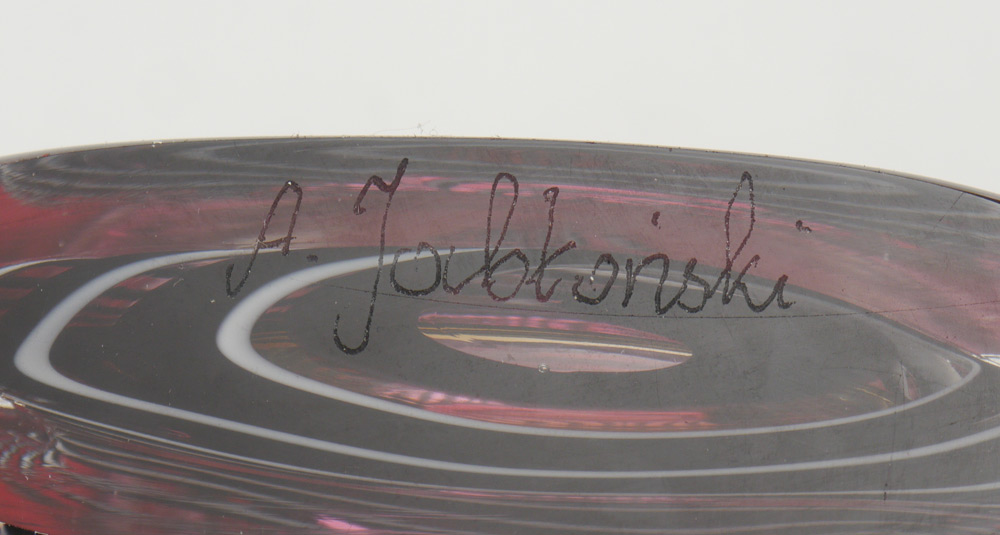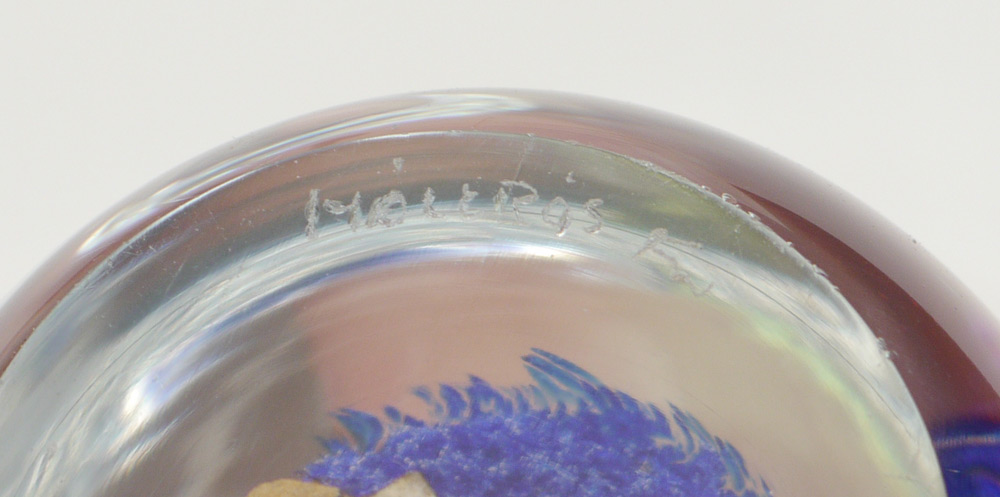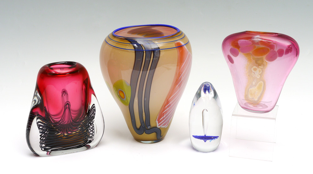 4 PIECE STUDIO ART GLASS VASES & PAPERWEIGHT: 4 pieces total to include 1) Adam Jablonski signed vase, 6 1/2'' h. x 5 3/4''. 2) Wes Hunting signed vase, 8 1/4'' h. x 6 3/4''. 3) Signed Nicholson vase, 5 1/2'' h. x 5 1/2''. 4 Signed Maleras paperweight with label, 5''.