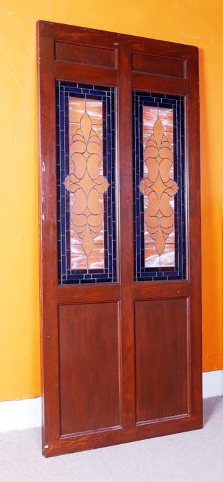 LARGE LEADED STAINED GLASS DOOR: Exterior door with 2 contemporary stained glass inserts, overall measures 92 1/2'' h. x 41 1/4'' x 2''.