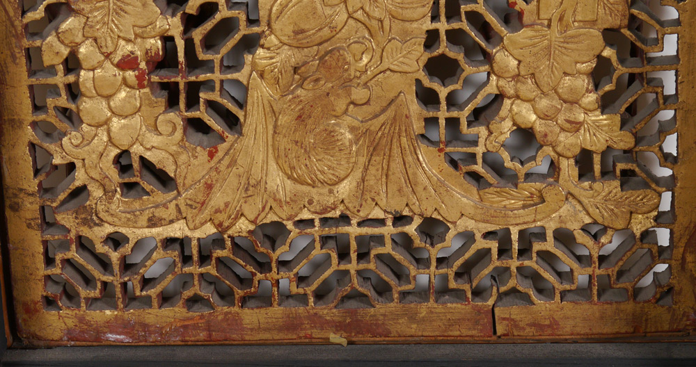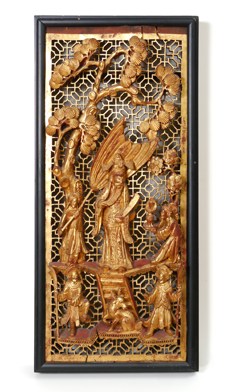 GILT DECORATED CHINESE WALL PANEL: Carved and pierced gilt over red lacquer panel, figures of a scholar with attendants and tree. Black lacquer frame. Overall measures 40 1/4'' x 19'' x 6''.