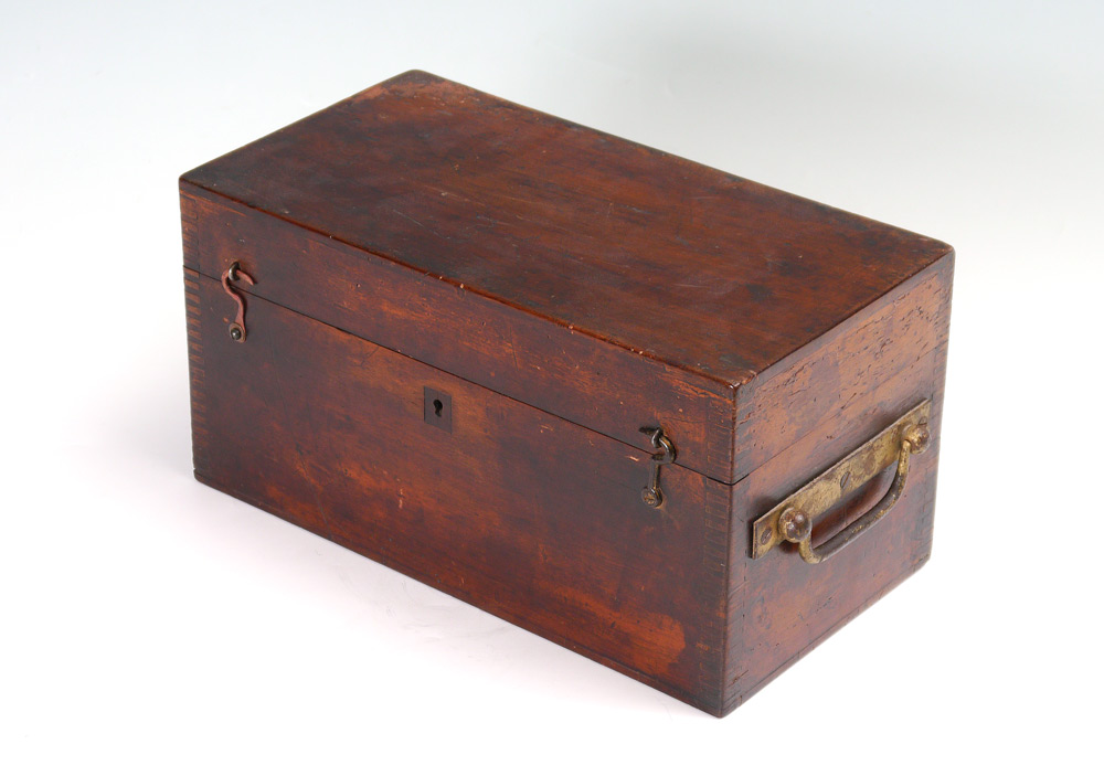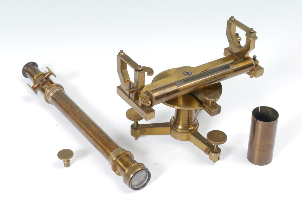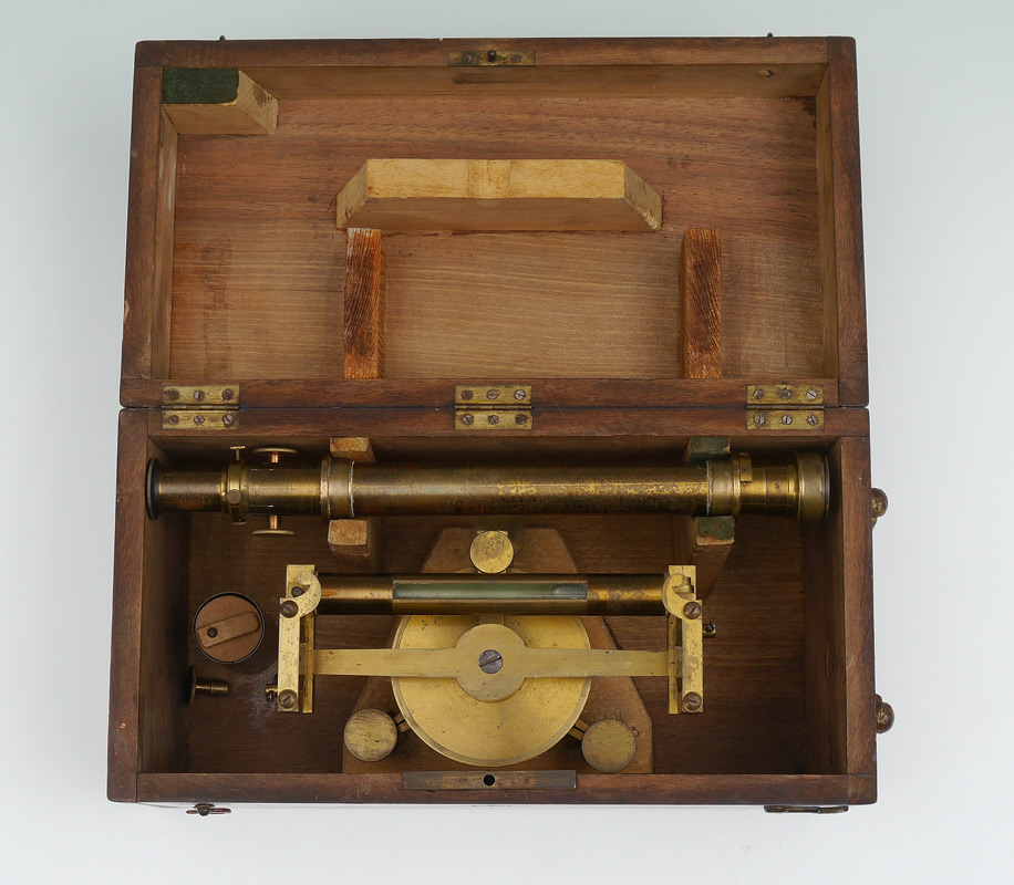 CONTINENTAL TRANSIT IN ORIGINAL BOX: Unmarked European brass surveyor's transit in original carrying case. Case measures 7 1/2'' h. x 15'' x 7 3/4''.