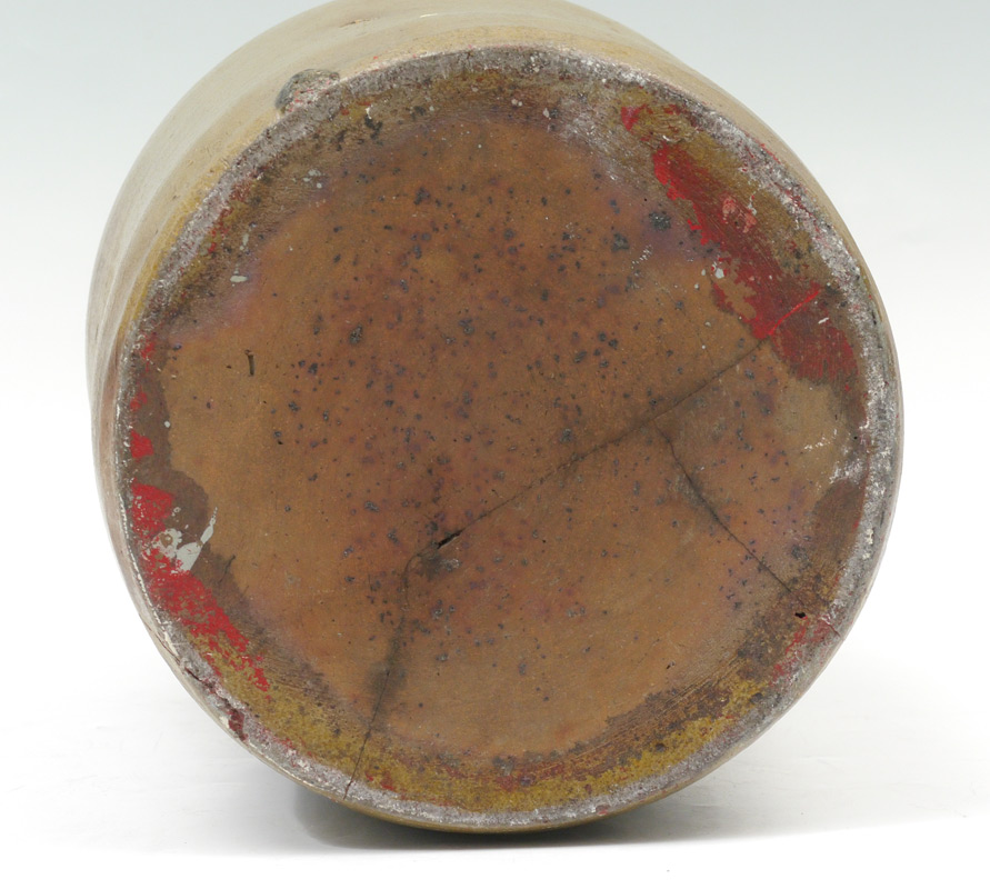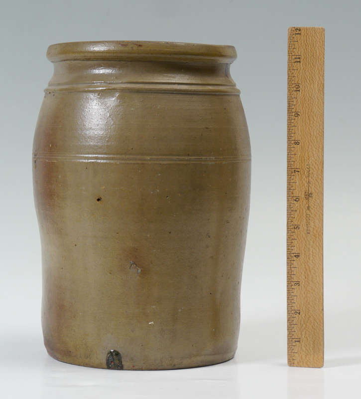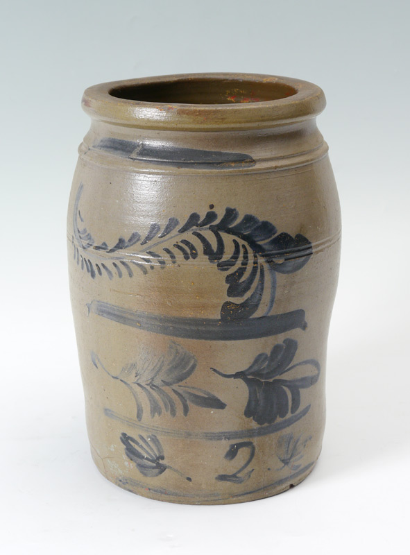 BLUE DECORATED 2 GALLON STONEWARE CROCK: Hand painted fern and foliate decoration, unmarked to maker. Measures 11 1/2'' h. x 8''.
