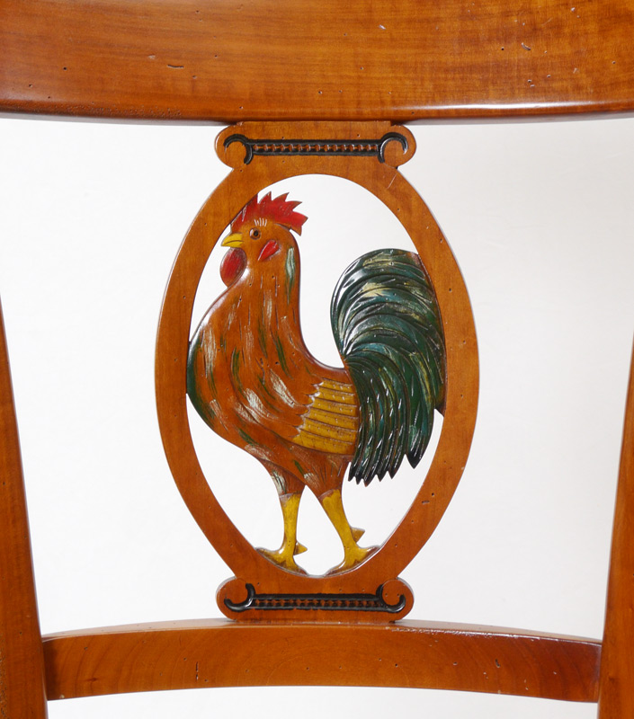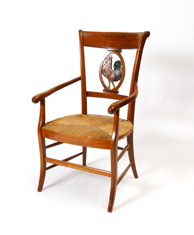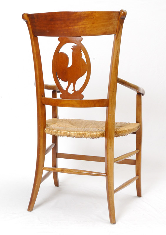 PERIGORD FRENCH COUNTRY ARM CHAIR: The back with a carved rooster, rush seat. Recently retailed for $995. 40'' h. x 23'' x 24 1/2''.