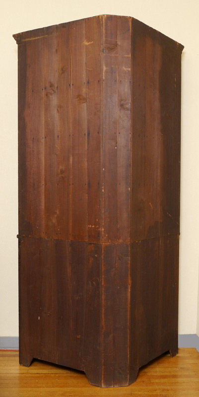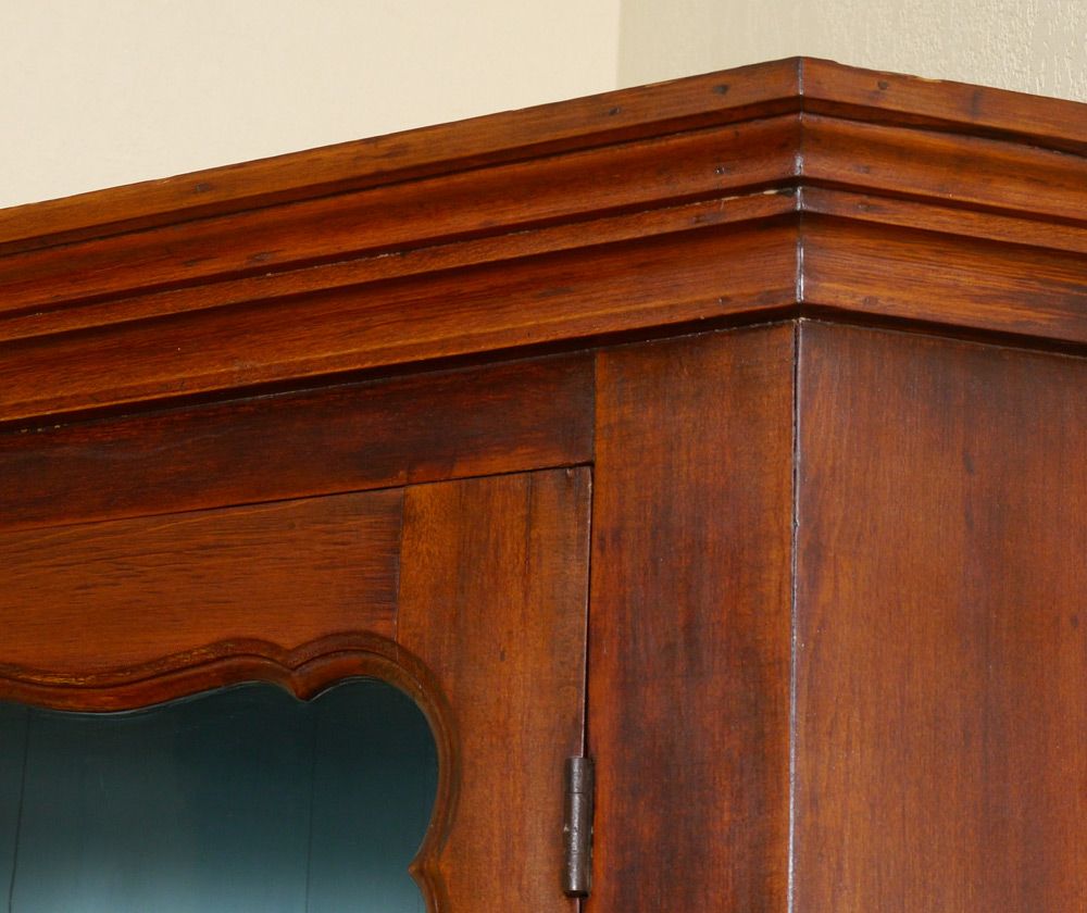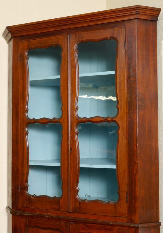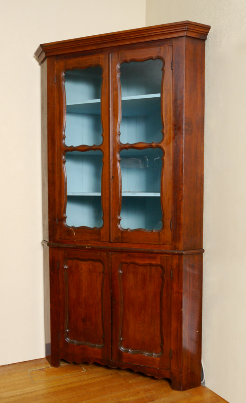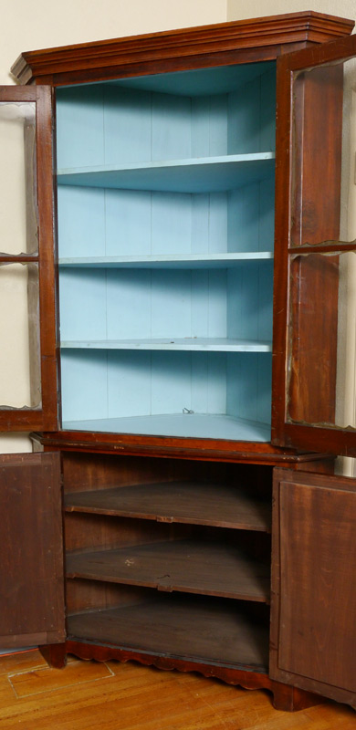 CHERRY CORNER CUPBOARD: Top with blue painted interior, 3 shelves, glass front doors with decorative framing. Blind base cabinet with 2 shelves. Overall measures 89'' h. x 48 1/2'' x 24 1/2''.