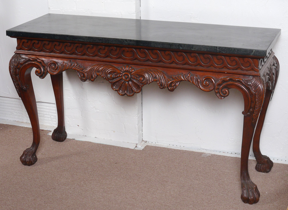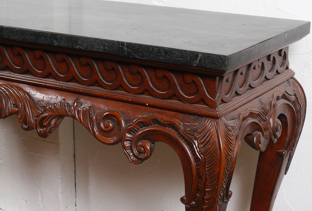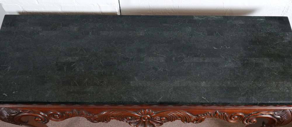 ORNATELY CARVED SOFA TABLE: Carved apron and knees on the cabriole legs ending in hairy paw feet. Faux dark green marble top. Later 20th C. Measures 35'' tall x 60'' x 25'' x 90''