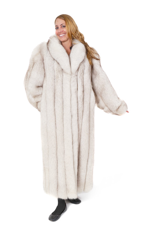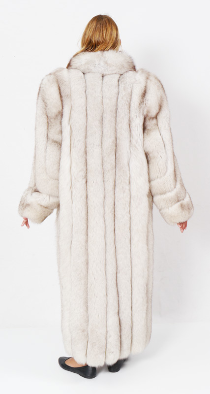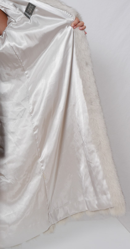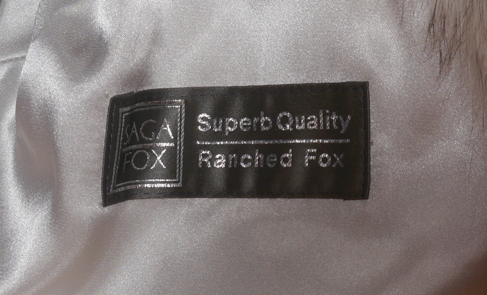 SAGA FOX FUR FULL LENGTH COAT: Luxurious plush fox fur coat, fully lined, Adolfo and Saga Fox, Ranched Fox labels. Large to XL in size, measures approx 53'' collar to hem, 26'' shoulder to cuff.