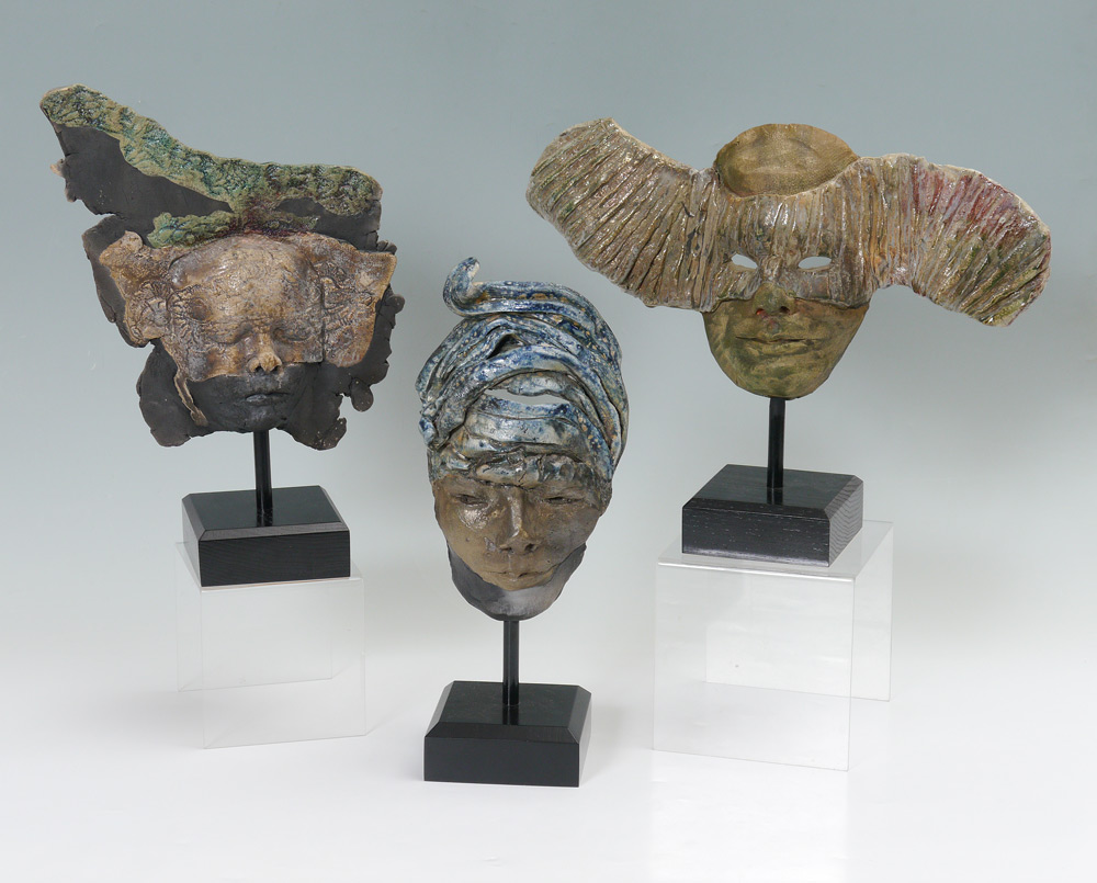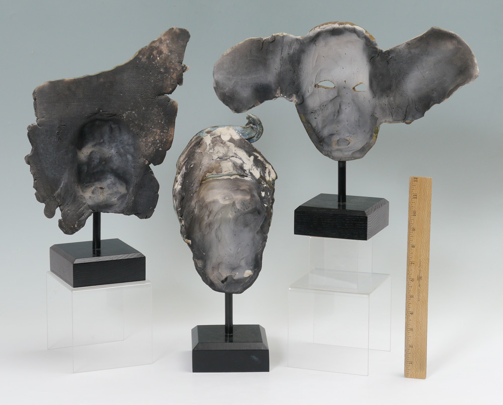 3 RAKU POTTERY MASKS: Each signed Conte, largest measures 15'' h. x 10 1/2'' x 4 3/4''.