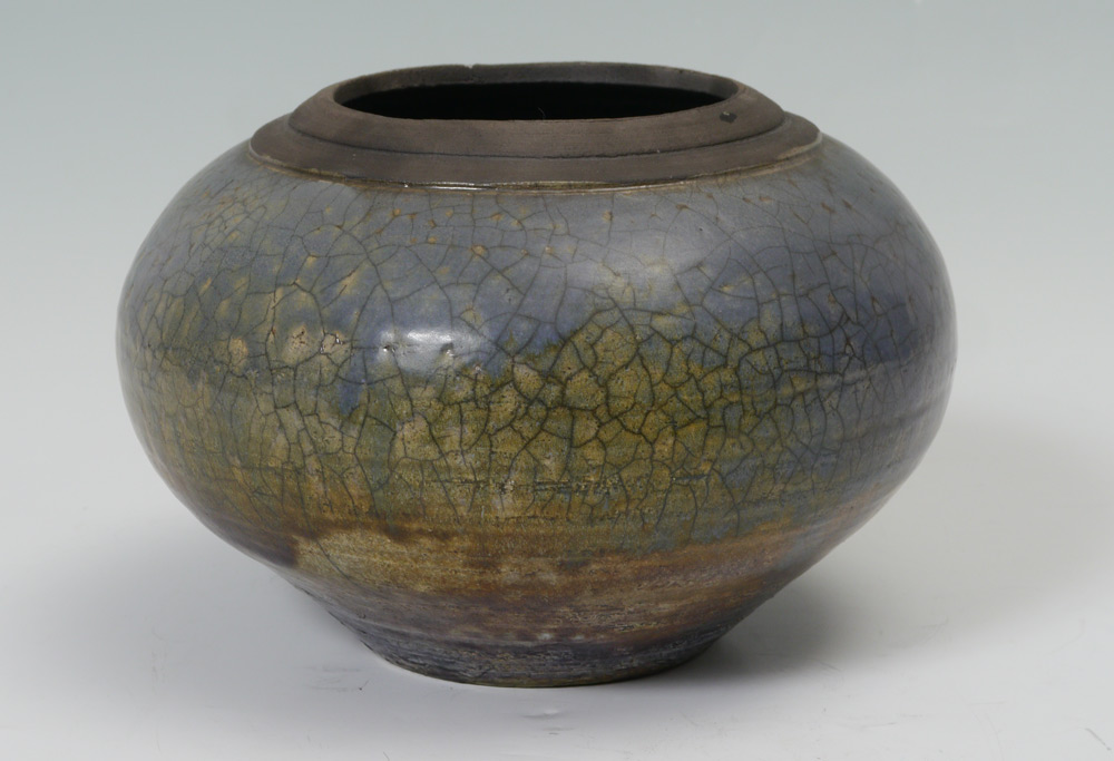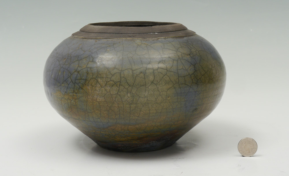 CONTEMPORARY STUDIO RAKU POTTERY VASE: Illegibly signed, Measures approx. 6.5'' tall x 9.5'' overall.