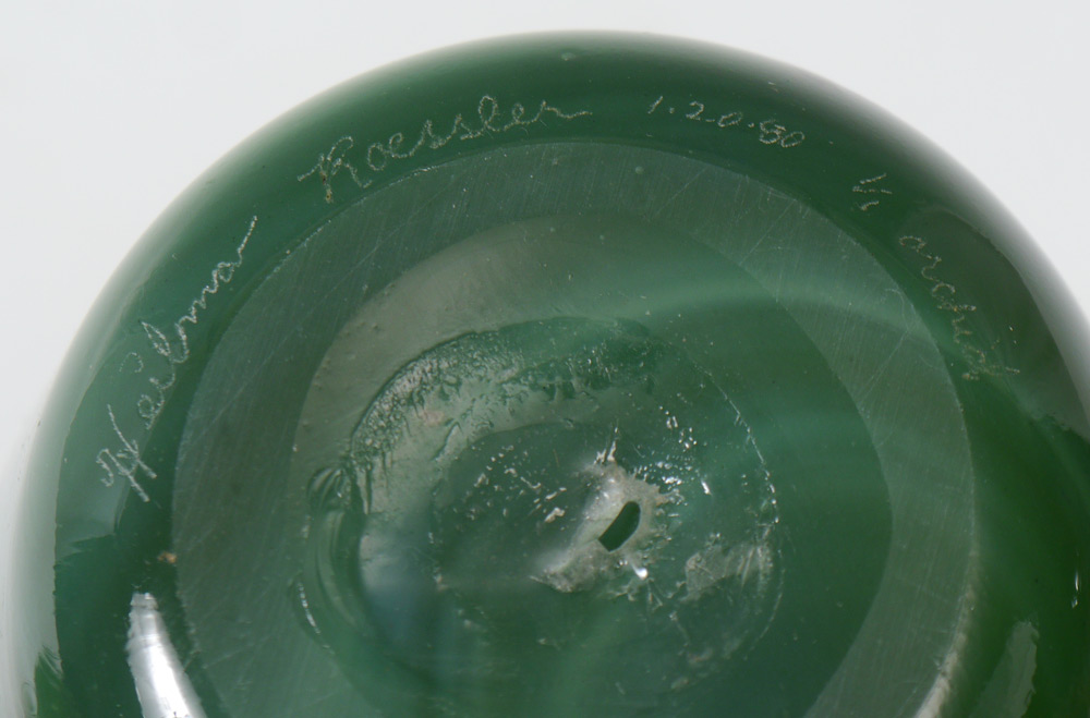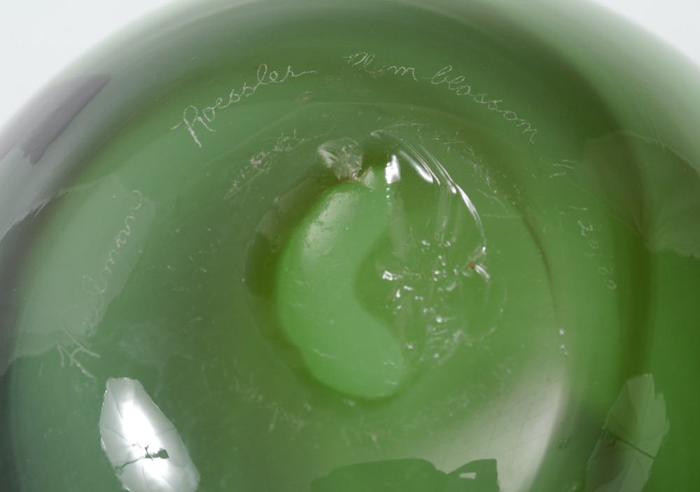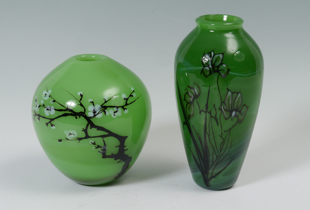 2 SIGNED ROESSLSER ART GLASS VASES: Studio glass signed Roessler and titled ''Plum Blossom'', 7'', and ''Orchid'', 10 1/2''.