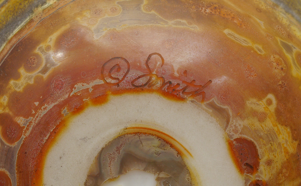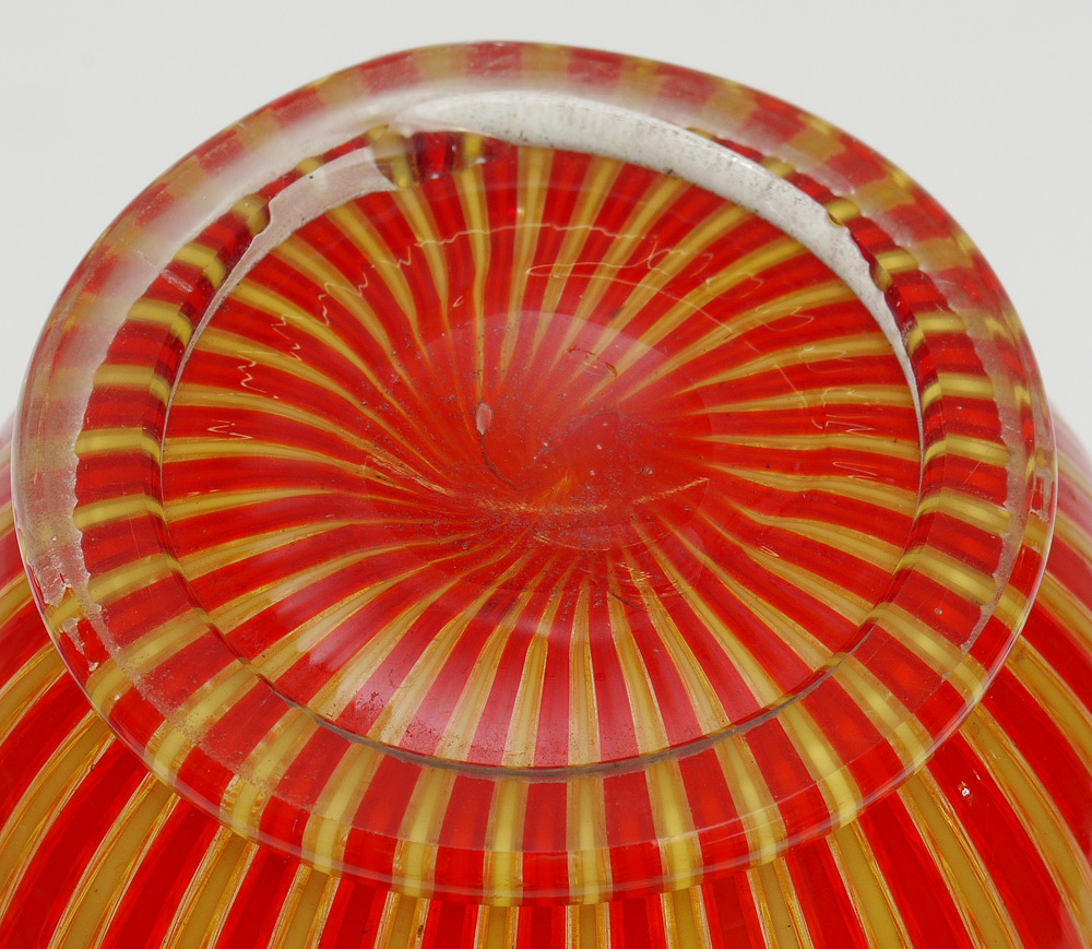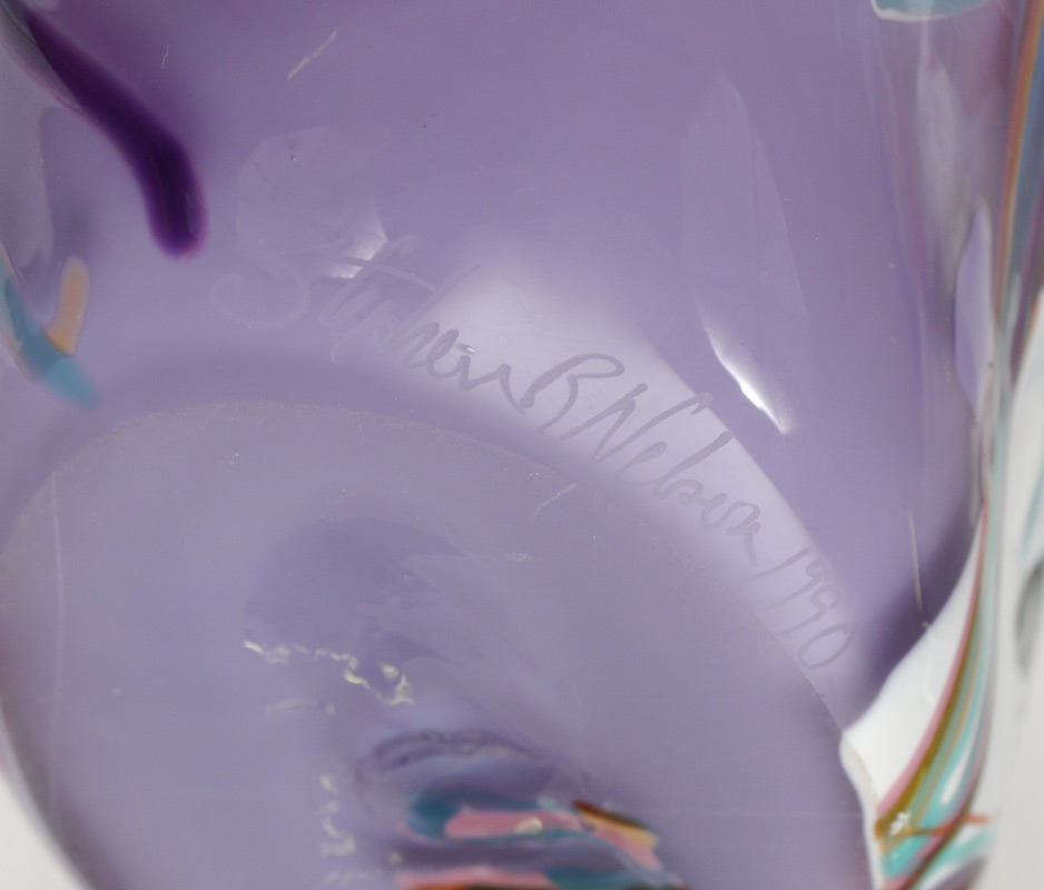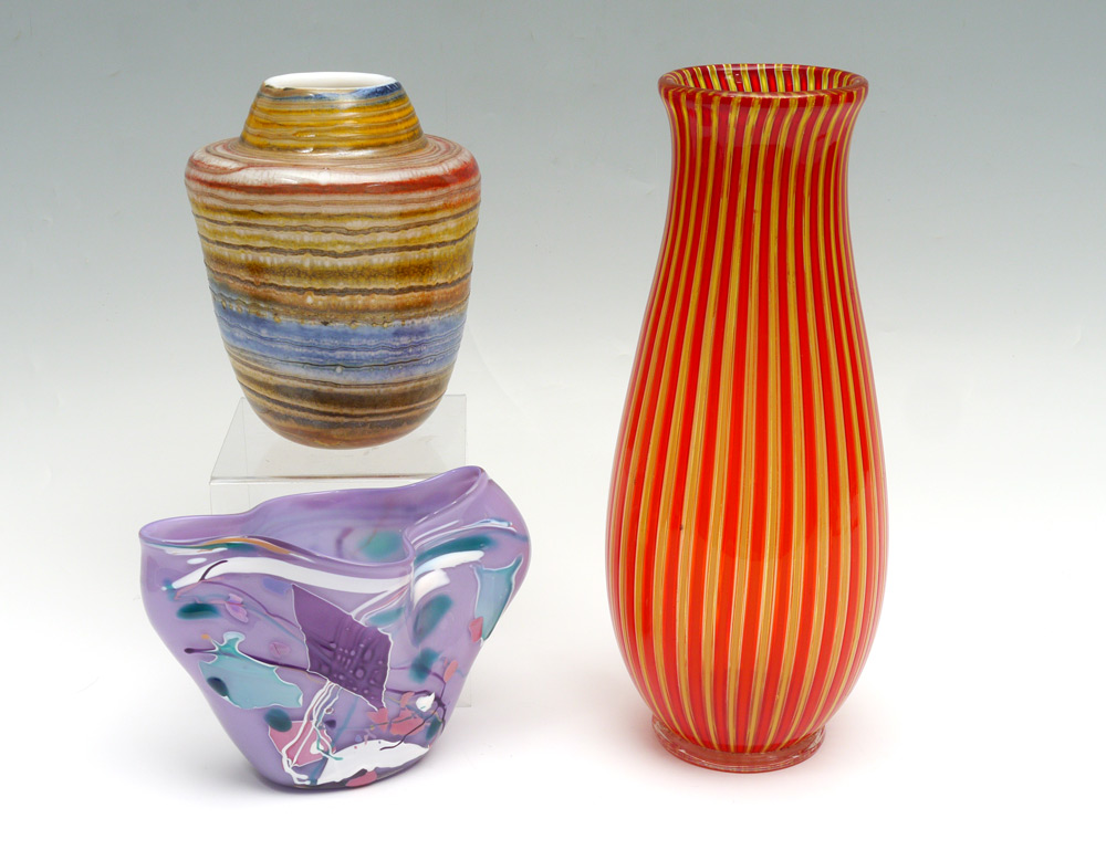 3 STUDIO ART GLASS VASES: Horizontal metallic stripes signed Smith, purple vase signed Nelsen?, and the Venini style vase is unsigned. Measure 5 1/2'' -13'' tall.
