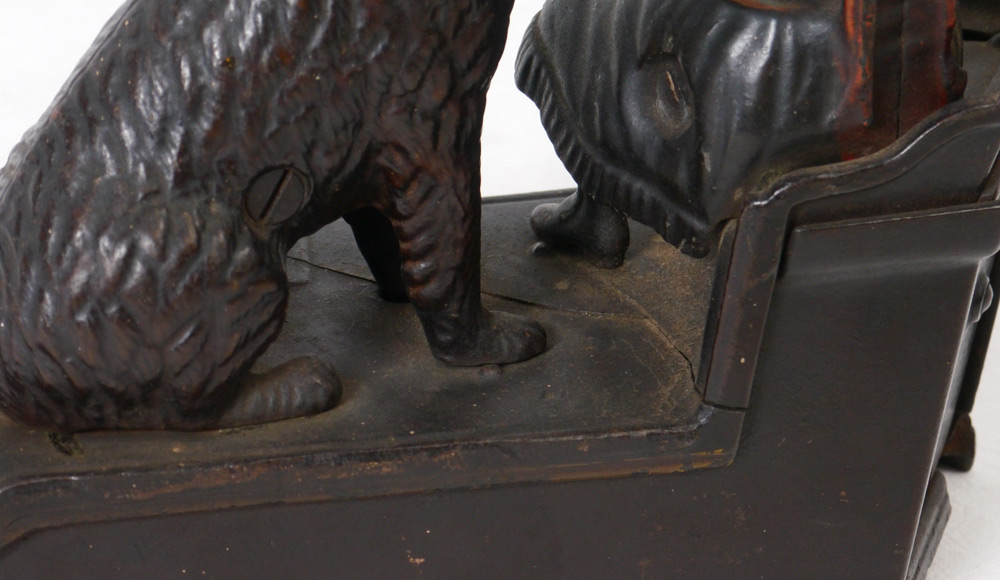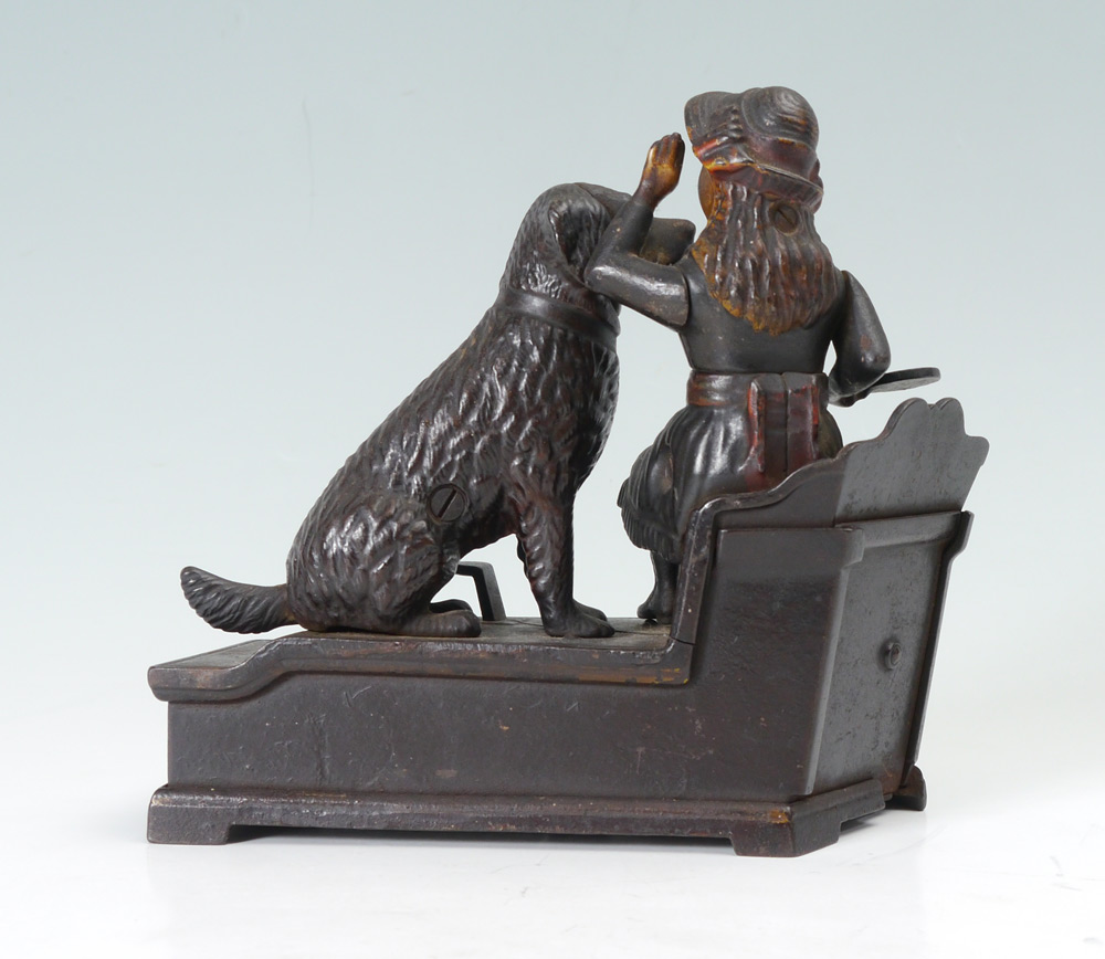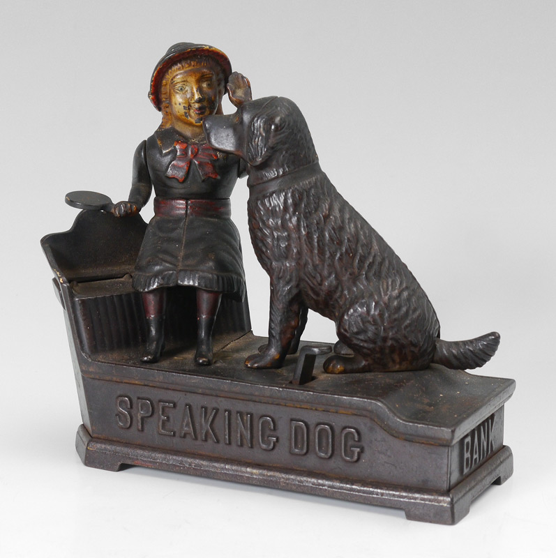 SPEAKING DOG CAST IRON MECHANICAL BANK: Working condition, patent dates of July 14, 1885 and Oct. 20 1885. Measures 7'' h. x 7 3/4'' x 3''.