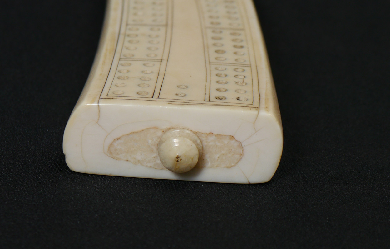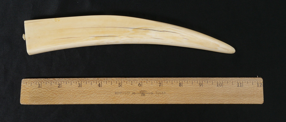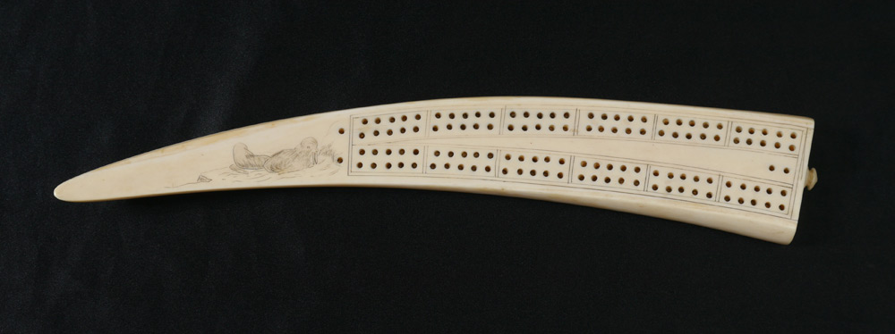 WALRUS IVORY TUSK CRIBBAGE BOARD: Scrimshaw of 2 walrus on ledge, no visible signature. Overall measures 10 1/2'' long.