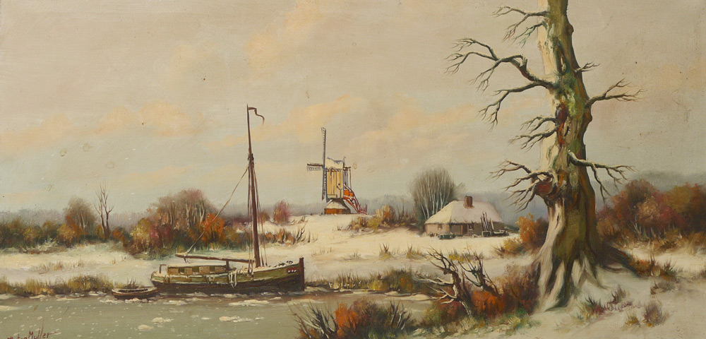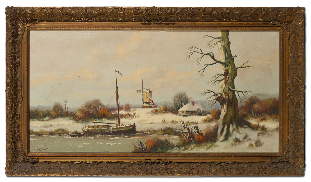 MULLER, Anton, (Dutch, 20th Century): Canal Scene in Winter with Windmill, Oil/Canvas, 15 3/4'' x 31 1/2'', signed lower left, carved and gilded gesso frame 21 1/2'' x 37''.