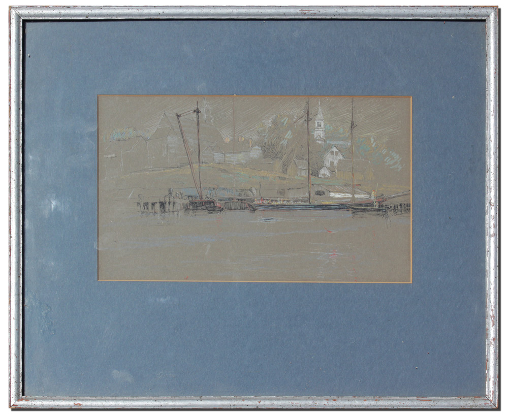 GOOD UNSIGNED PEN & INK DRAWING OF A COASTAL TOWN: Sight size 7'' x 12'', silver gilt frame 15 1/4'' x 18 3/4'', no visible signature.