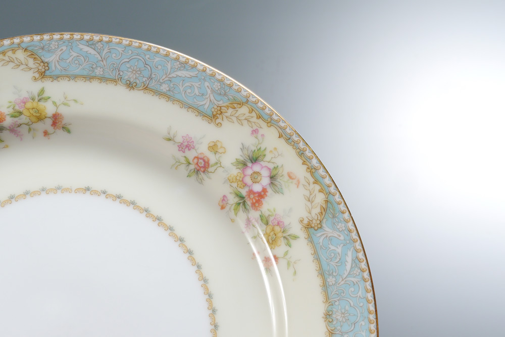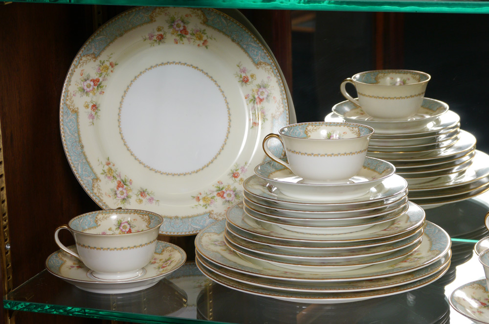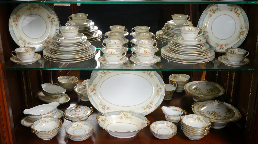 NORITAKE FINE CHINA ''BLUEDAWN'': Approx. 60 pieces to include 8 dinner plates (10''), 8 salad plates, 8 bread plates, 8 soup bowls, 8 cups with 8 saucers, 7 dessert bowls, creamer, sugar, gravy boat, covered vegetable bowl, and the 16 1/4'' platter.