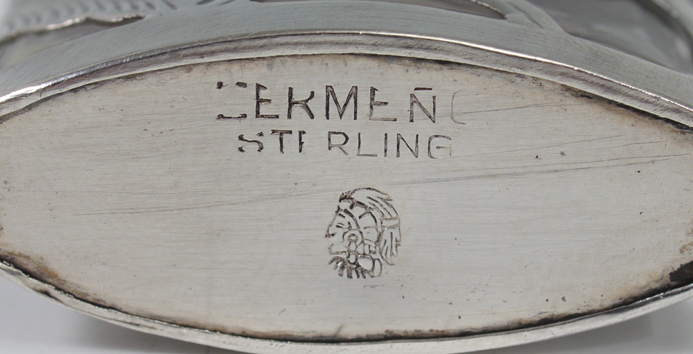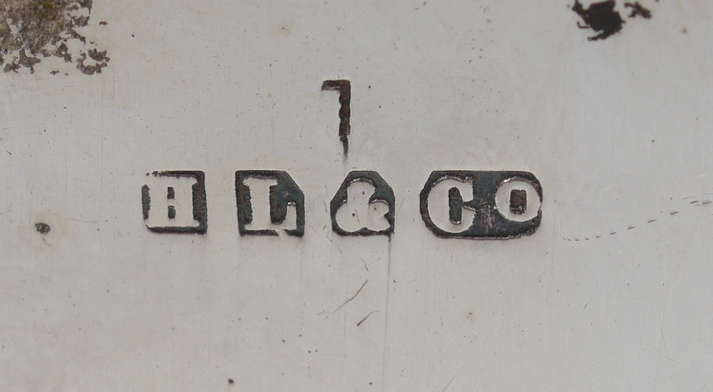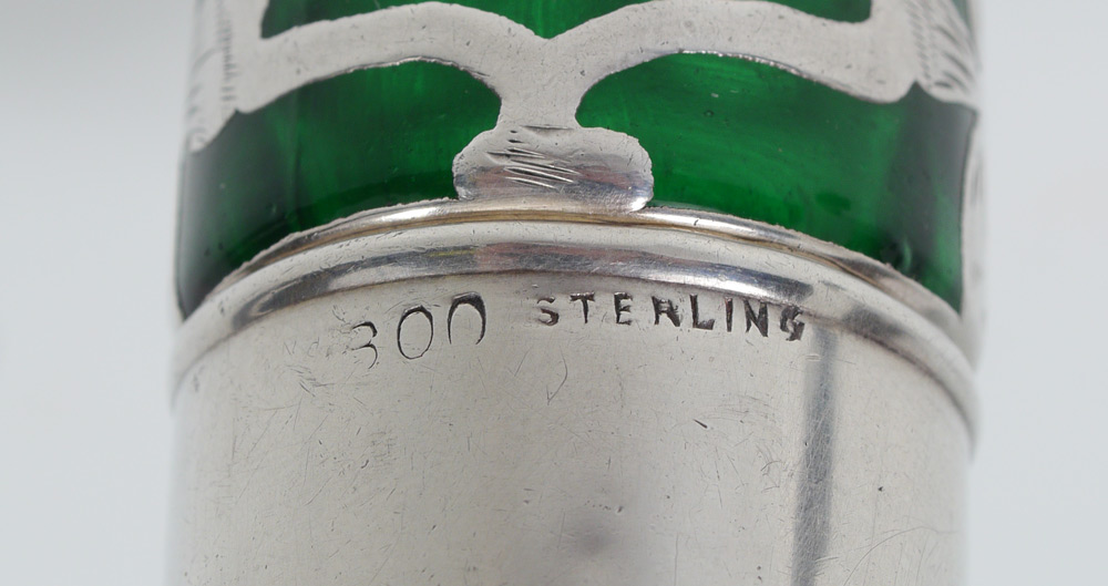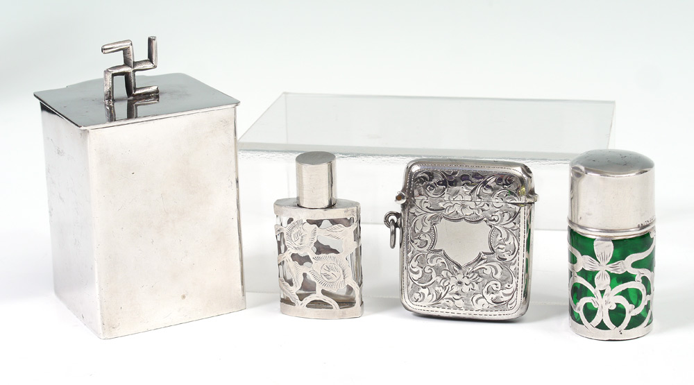 4 PIECE SILVER OBJETS DE VERTU: 4 pieces total to include 1) 1910 Birmingham sterling match safe by Richard Martin & Ebeneezer Hall-Martin. 2'' x 2''. 2) Cermeno sterling overlay perfume bottle 2 1/4'' long. 3) Silver overlay green glass perfume, marked 800 Sterling on lid, 2 1/4'' h. 4) Hamilton, Laidlaw & Co, silverplate tea caddy with swastika finial, 3 3/4'' h. x 2 1/4'' x 2 1/2''.