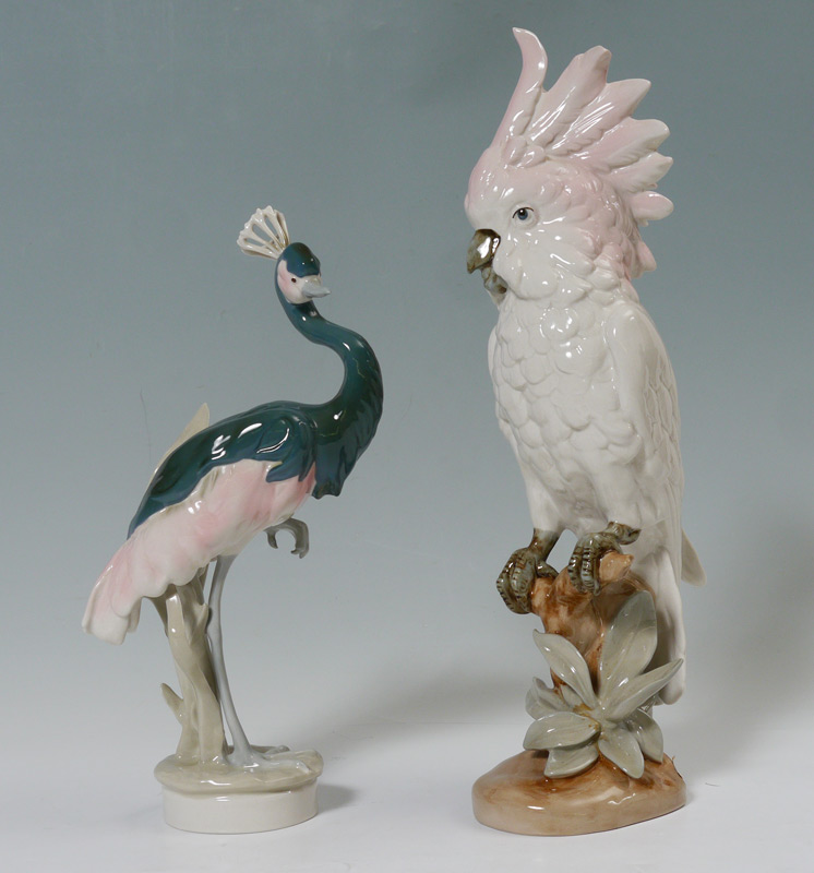 ROYAL DUX COCKATOO & CROWNED CRANE PORCELAIN BIRD FIGURINES: 1) Cockatoo perched on a branch, 16'' h. x 4 1/2'' x 6 1/2''. 2) Crowned crane, 12 3/4'' h. x 4 1/2''. 6 1/4''.
