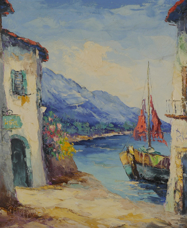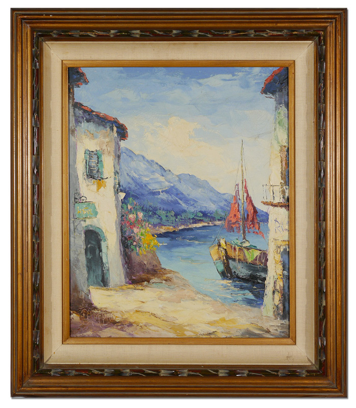 MEDITERRANEAN VILLAGE ON THE WATER PAINTING SIGNED CAMPRIO: 24'' x 20'', signed lower left, carved frame 33 1/2'' x 29 1/4''.
