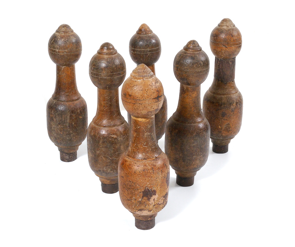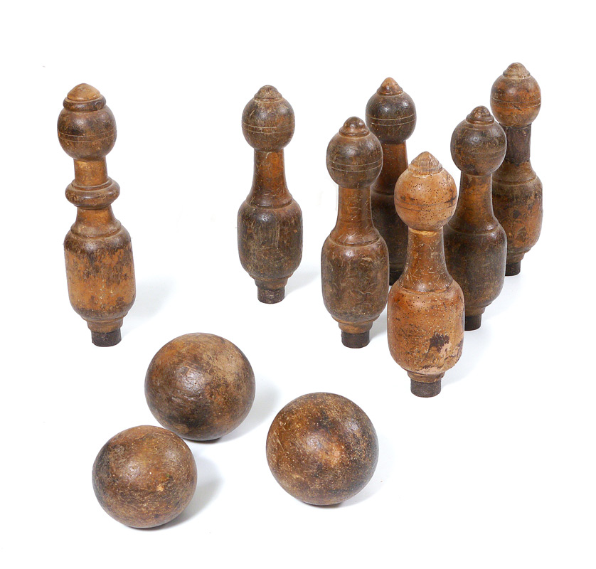 1850 ITALIAN LAWN BOWLING GAME: Set of 7 pins (17'' h. x 4''), and 3 balls (the 2 larger 5'' dia.).