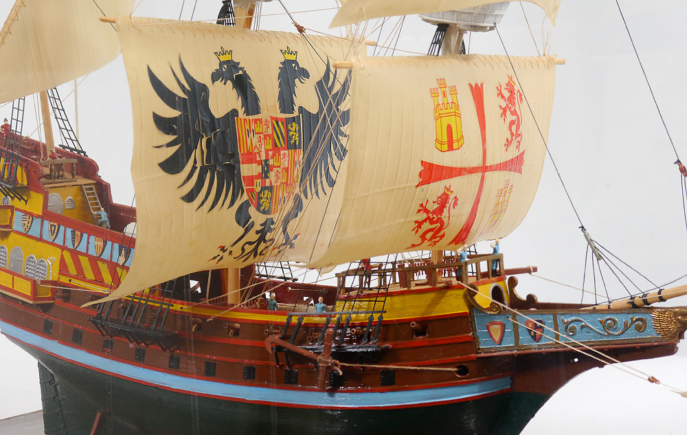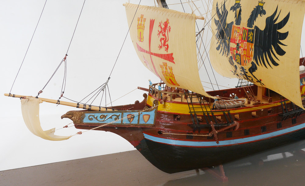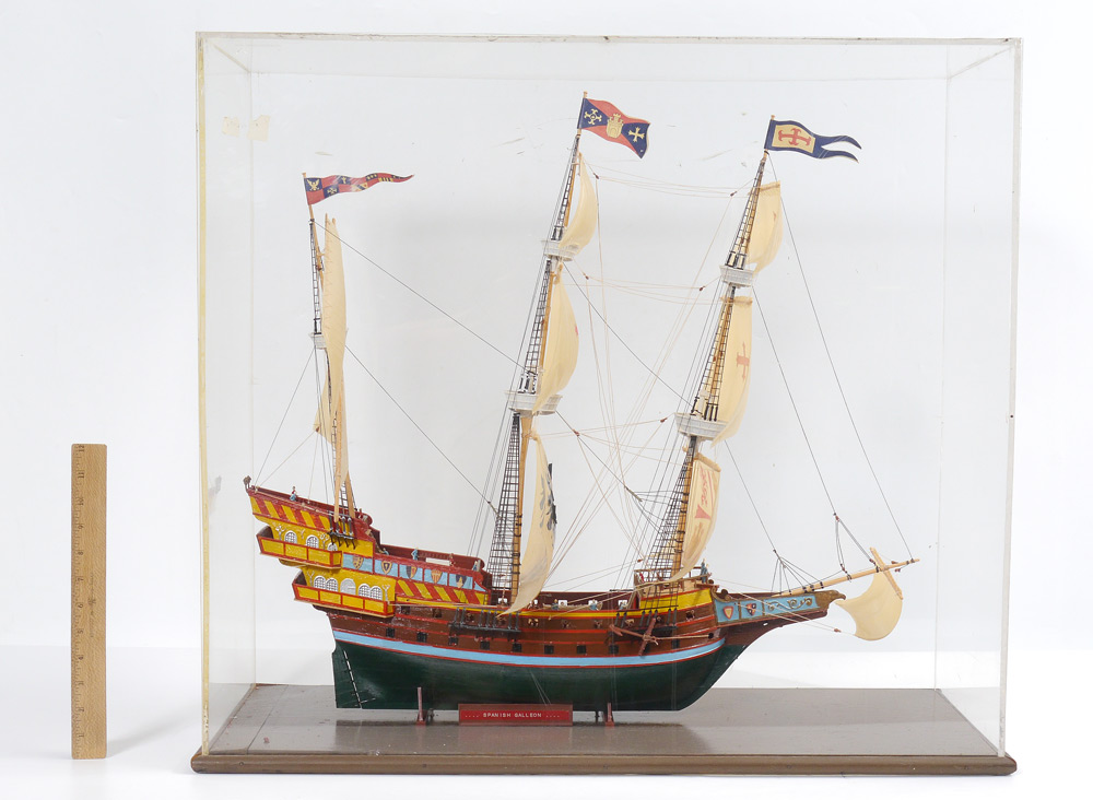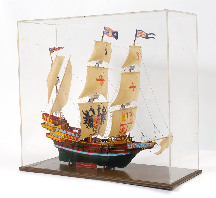 CASED SPANISH GALLEON SHIP MODEL: Well executed hand crafted model of a Spanish galleon ship encased in a Lexan case with wood bottom. 27 1/4'' h. x 30 3/4'' x 12 1/4''.