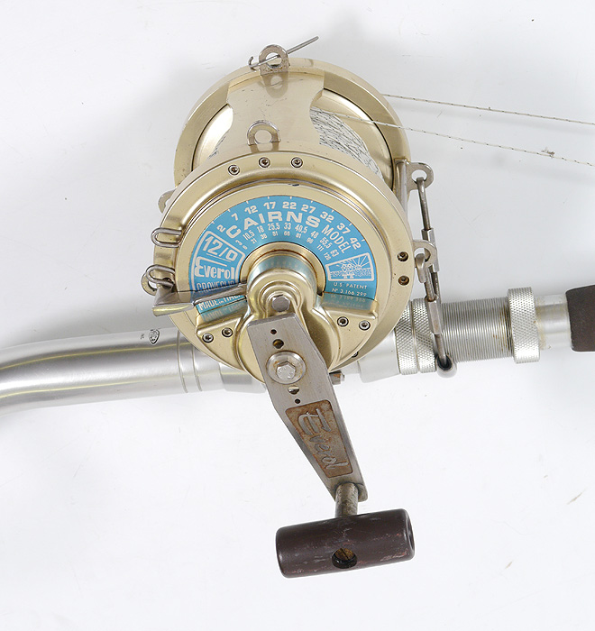 BIG GAME EVEROL CAIRNES 12/0 FISHING REEL & FENWICK BENT BUTT ROD WITH AFTCO ROLLERS: 7' 8''