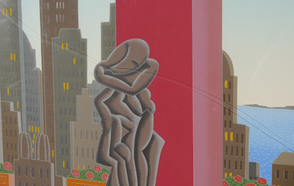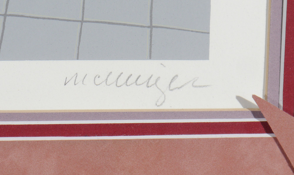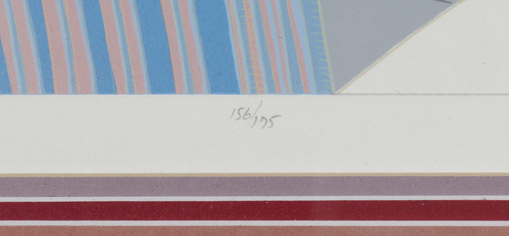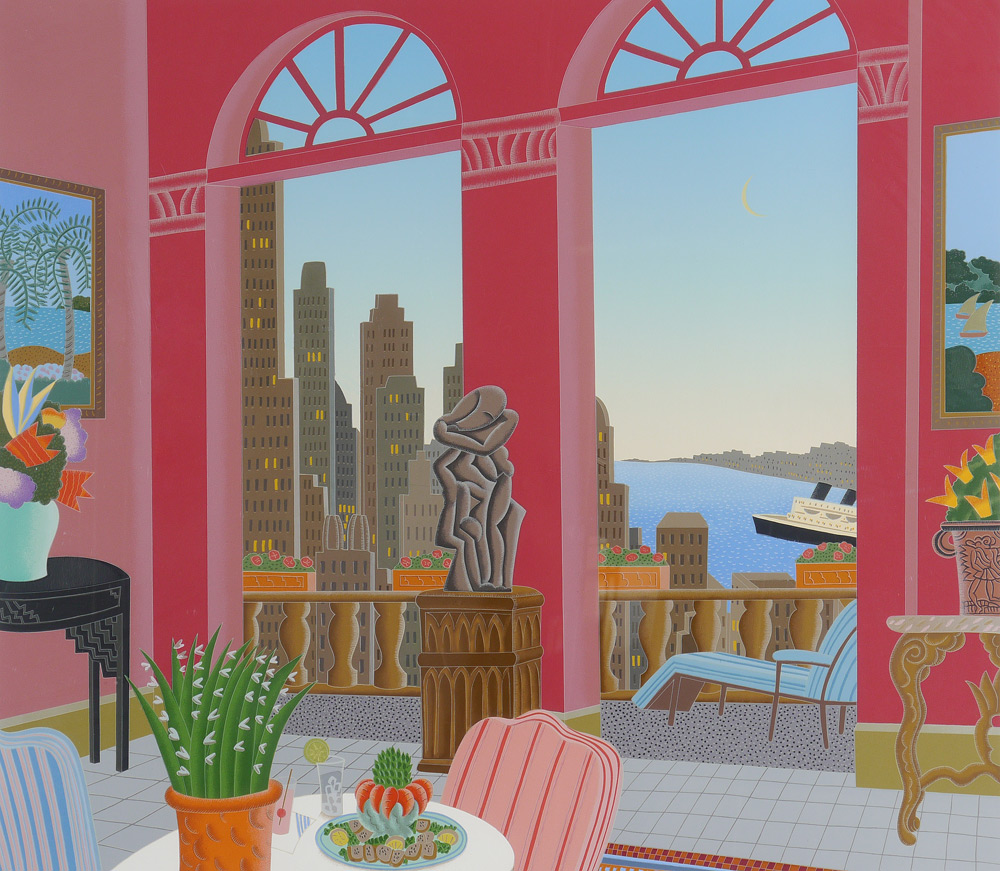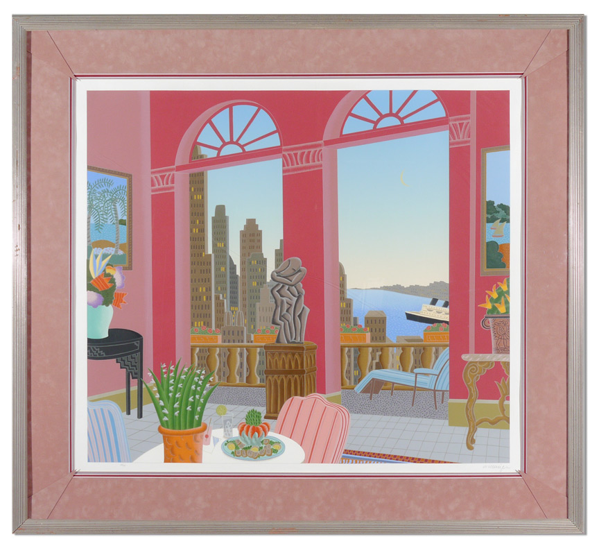 MASSIVE THOMAS MCKNIGHT SERIGRAPH: Interior Scene Overlooking a Harbor, Sight size 36'' x 41'', pencil signed lower right, #'d 156/175 lower left, custom frame and mat 48'' x 53''.
