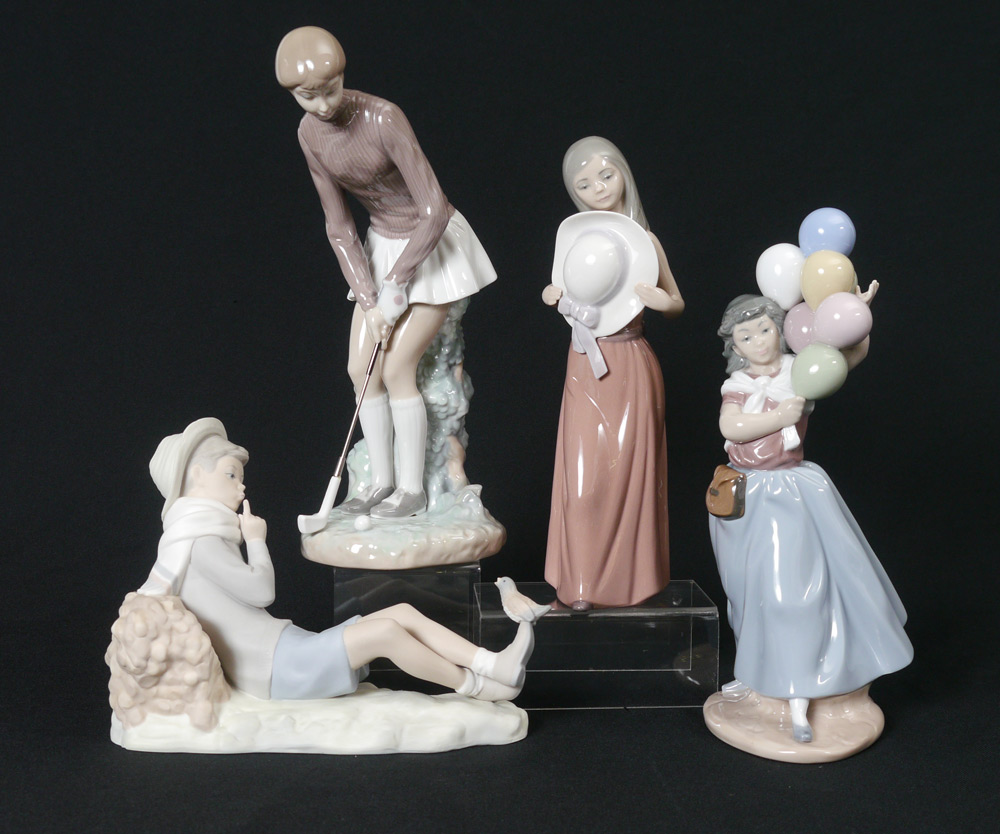 LLADRO PORCELAIN FIGURINES: 1) Shepherd with Bird #4730, Matte finished, Vincente Martinez sculptor, issued 1970 retired 1985, 6.25''h. x 8.5'' x 5''. 2) Lady Golfer #4851, Vincente Martinez sculptor, issued 1973 retired 2005, 11.25'' x 5.25'' x 4.5''. 3) Bashful #5007, Francisco Catala sculptor, issued 1978 retired 1997, 9.75'' x 3.25'' x 3''. 4) Balloons for Sale #5141, Vincente Martinez sculptor, issued 1982 retired 1996, 10.5''h. x 5'' x 4.5''.