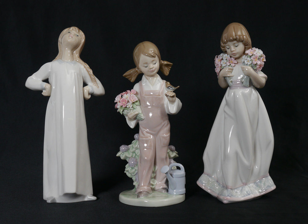 LLADRO PORCELAIN FIGURINES: 1) Girl Stretching #4872, Fulgencio Garcia sculptor, issued 1974 retired 1999, 8''h. x 3.75'' x 2.5''. 2) Spring #5217, Juan Huerta sculptor, issued 1984, 7.5''h. x 3.25''. 3) Spring Bouquets #7603, Society Piece 1987, Juan Huerta sculptor, 8.75'' x 3.5''.