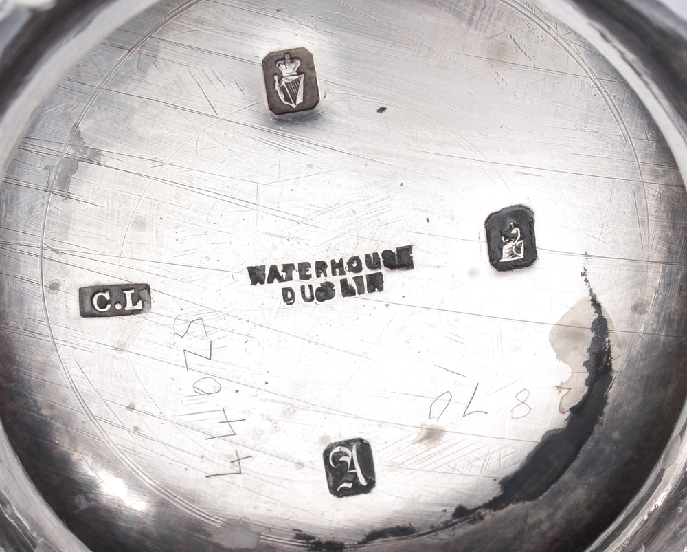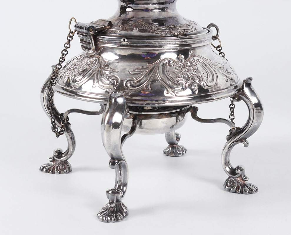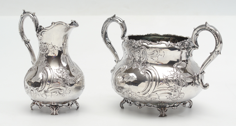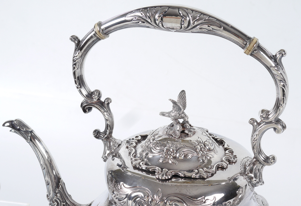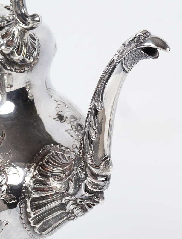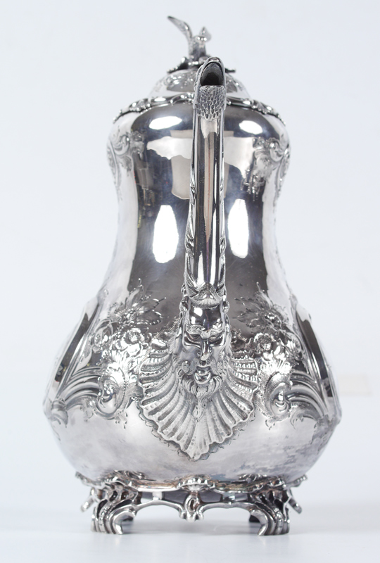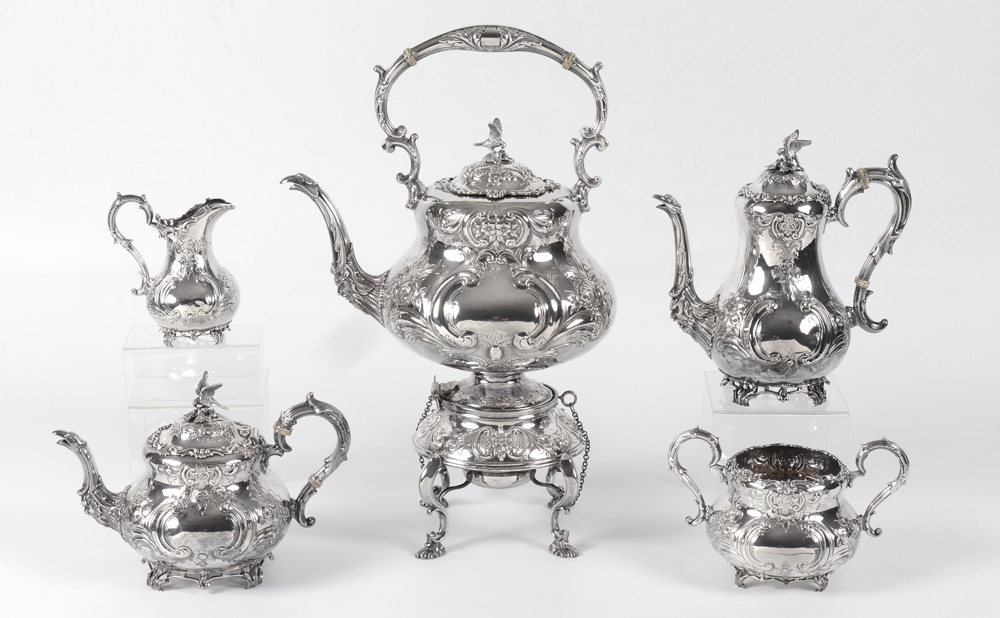 5 PIECE ORNATE ENGLISH STERLING SILVER TEA SERVICE: An assembled collection with a matching floral repousse motif to include 1) 1896 Charles Lamb, Dublin, hot water kettle on stand. Hinged lid with eagle finial, figural masqueron and bird head on spout. Paul Storr, London, 1815 marked burner. Overall 19 1/4'' h. x 12''. 2) 1920 William Gibson & John Langman, ''Goldsmiths & Silversmiths Co.'', London, coffee pot. Hinged lid with eagle final, matching spout, 10'' h. x 9 3/4''. 3) Gibson & Langman teapot, hinged lid with eagle finial, matching spout, 7 1/2'' h. x 10 1/2''. 4) Gibson & Langman open creamer 5 3/4'' h. x 5''. 5) Gibson & Langman open sugar, 5 3/8'' h. x 8 1/2''. Approx. 148.9 troy oz.