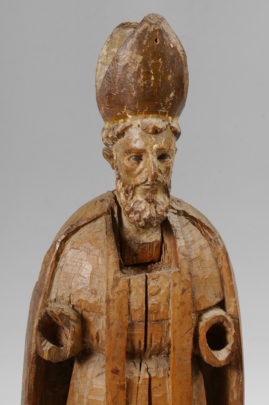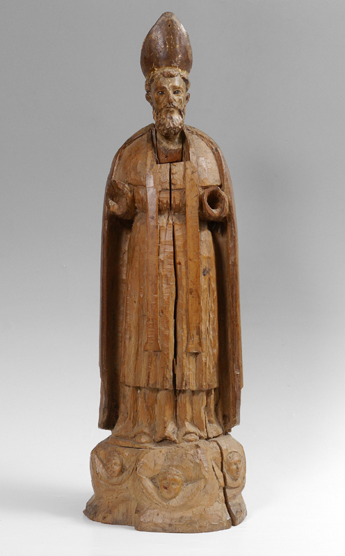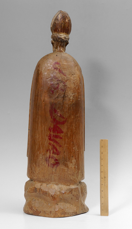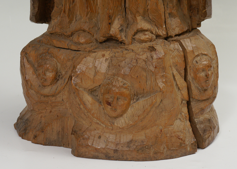 ANTIQUE CARVED WOOD SANTO: 33'' tall, having glass eyes, the base carved with angel masquerons. Shippers note the head is removable. Measures 11'' dia. at the base.