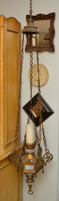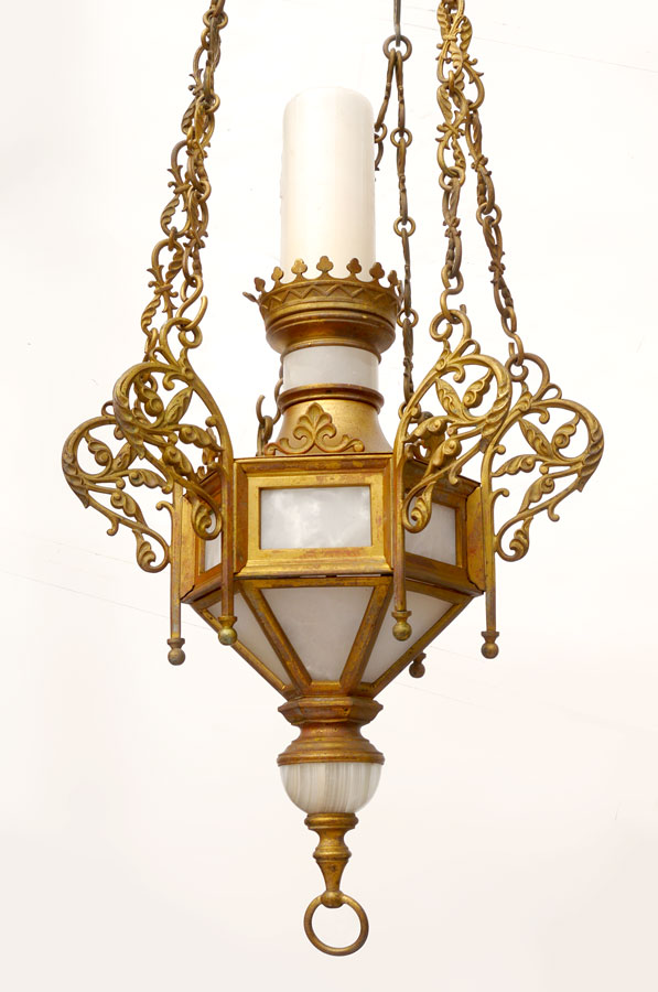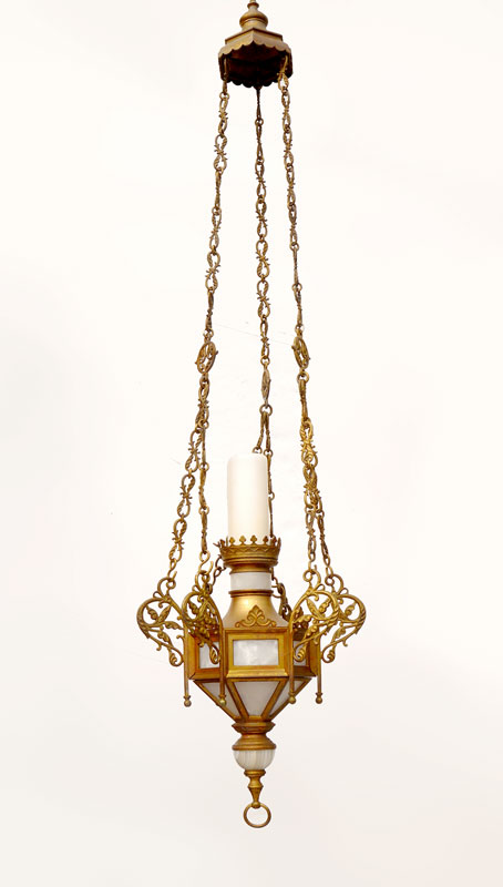 BRASS SANCTUARY LAMP FROM CHURCH: Heavy brass frame with alabaster accents, holds single large candle. Base measures 19 1/2'' h. x 15 1/2'' dia., each chain 41'' from cap, cap 8 1/4'' h., 65'' overall.