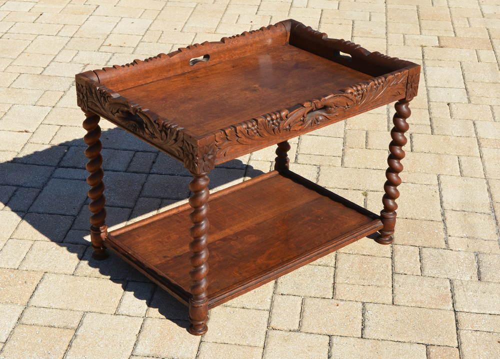 BARLEY TWIST OAK TEA TABLE: Top with carved foliate motif gallery, barley twist legs, lower open shelf support. Overall measures 20 1/2'' h. x 28 1/2'' x 19''.