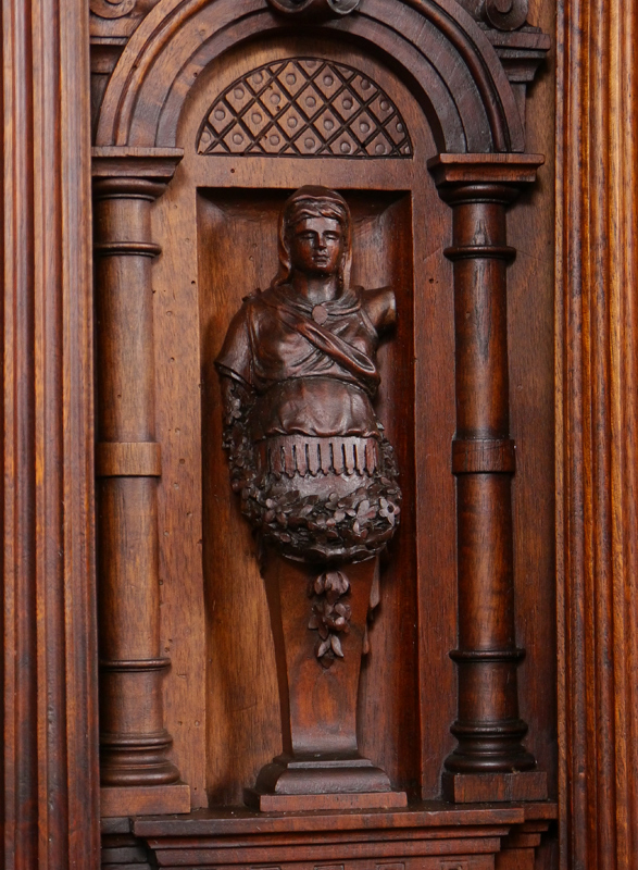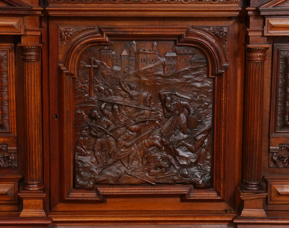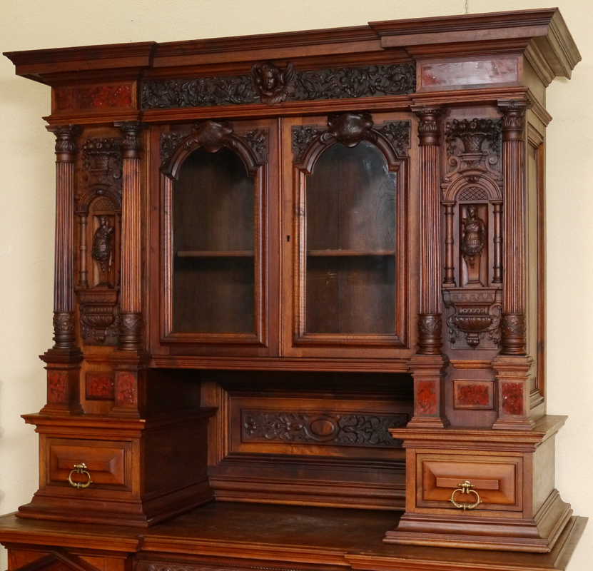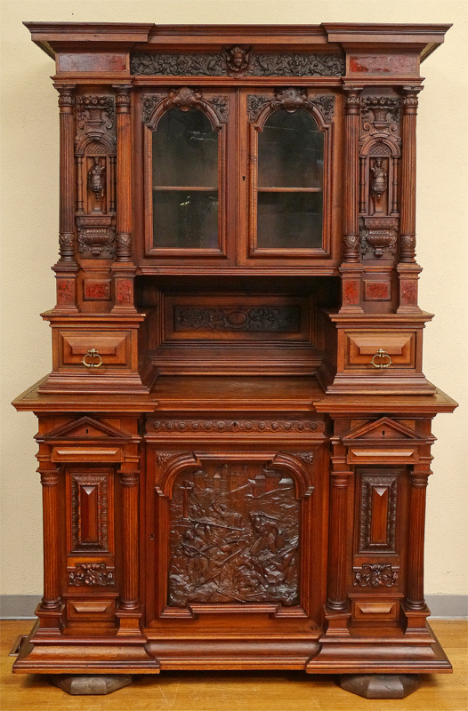 CARVED VICTORIAN COURT CUPBOARD: Top profusely carved with cherub, birds, figural maidens, architectural accents, floral and fruit motifs. Inset marble panels, 2 glass front doors with single shelf. Base, also carved, with central drawer over door with carved medieval battle scene. 2 large side doors with neo-classical architectural motif. Measures 88'' h. x 60'' x 26''.