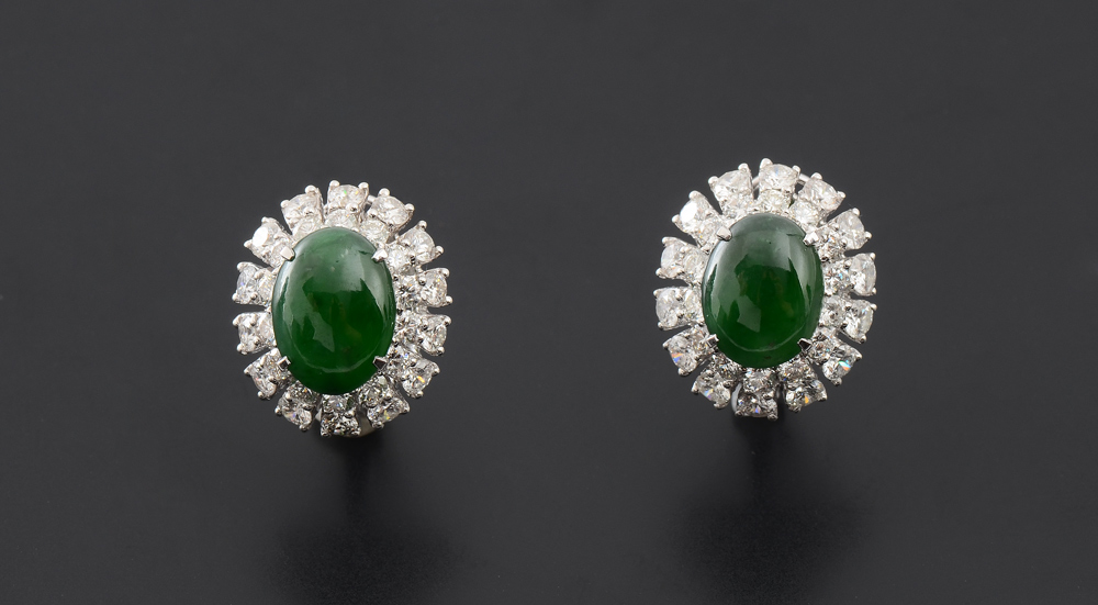 18K DIAMOND & JADEITE EARRINGS: 18K white gold earrings centering two cabochon cut pieces of green jadeite, approx. 4.94 Ct. framed by a double ring of 56 round brilliant cut diamonds totaling approx. 2.42 Ct., rated VS-SI in clarity and G-H in color. Jade and diamonds are prong set. Weight: 7.8 grams. Post and hinged clip closures.