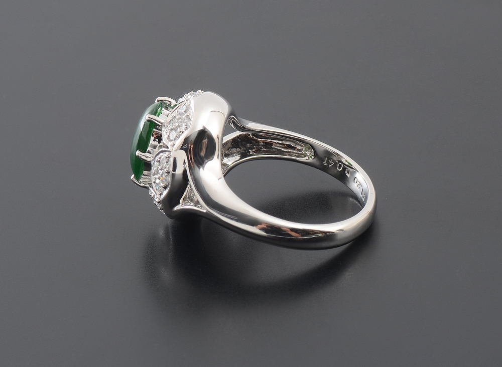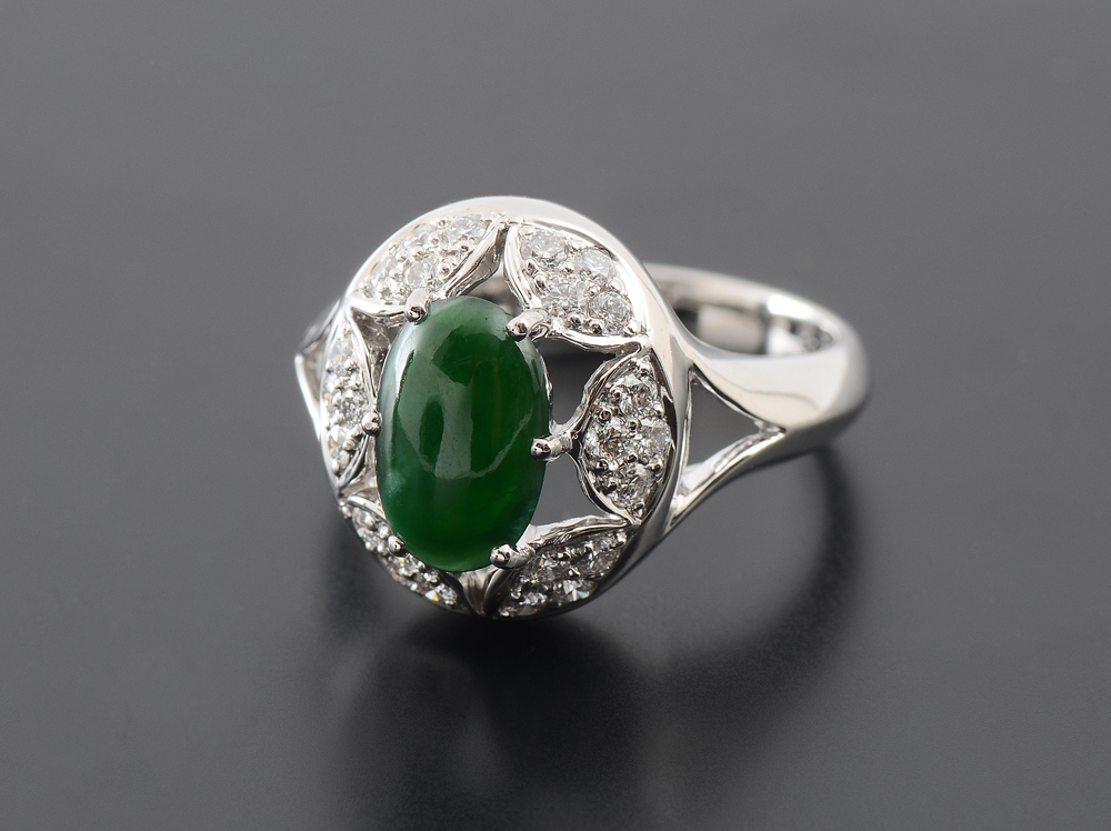 18K DIAMOND AND JADEITE RING: 18K white gold ring centers one cabochon cut pieces of green jadeite, approx. 1.20 Ct. with a melee of 24 round brilliant cut diamonds totaling approx. .41 Ct. Approx. Rated VS in clarity and G-H in color. Jade and diamonds are prong set. Weight: 6.6 grams. Size: 6